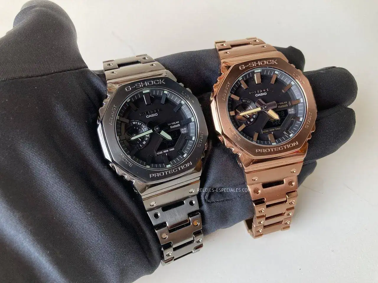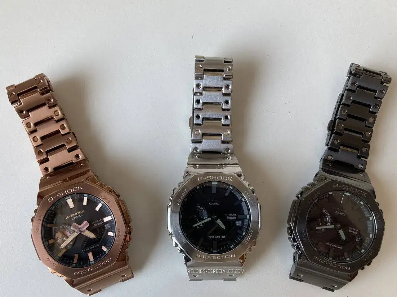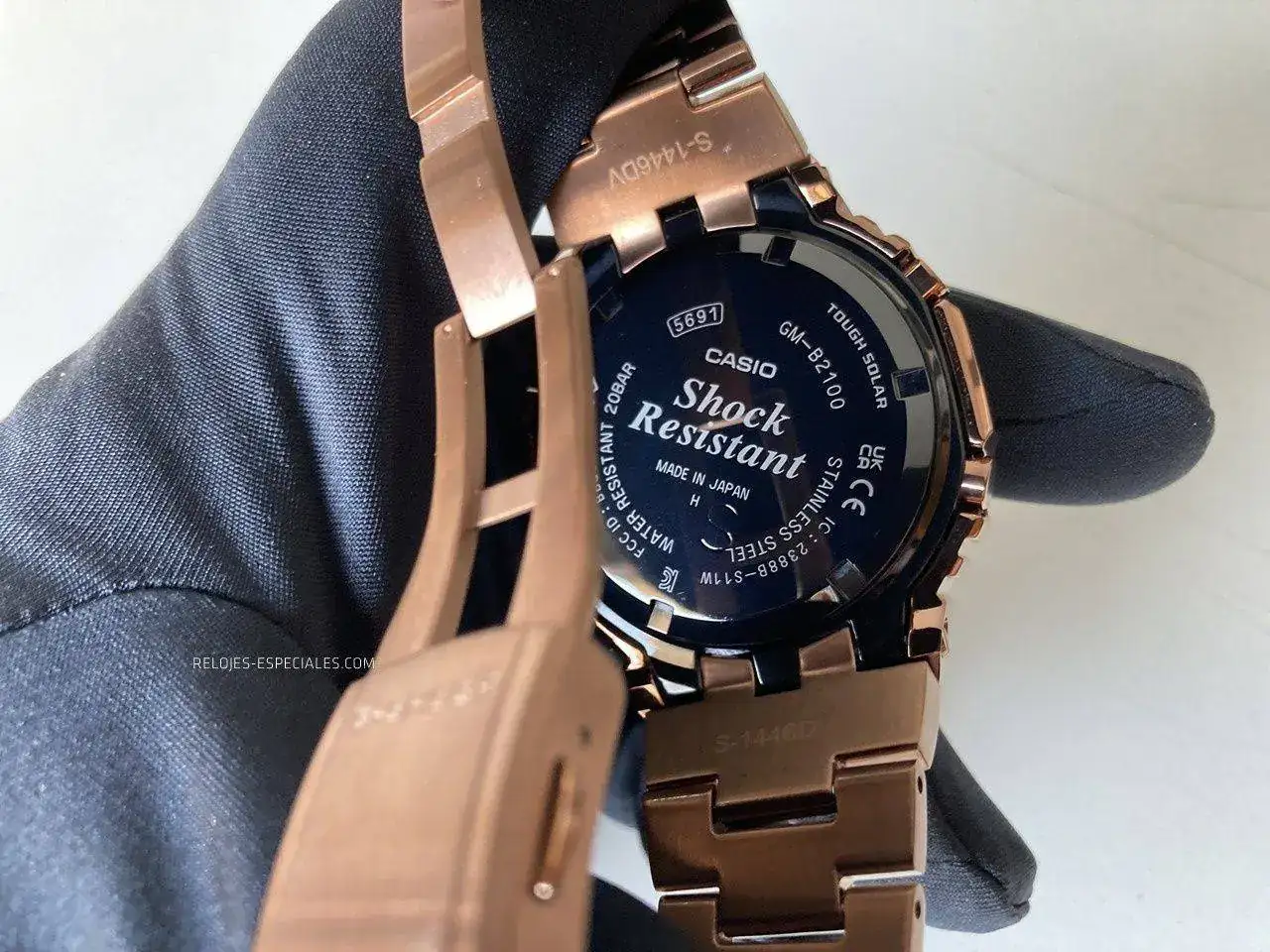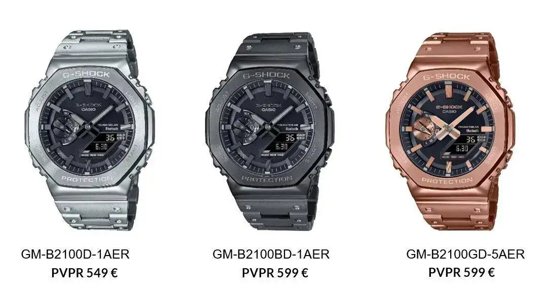 Tal vez sea por esto (y porque ya ocurrió con el DW-5000, que se "ironmaizó" en el GMW-B5000 X-ER) Casio presenta hoy el GM-B2100. Caja y brazalete completamente en acero incluyendo el fondo -roscado- y en tres tonos: acero, "gun metal" y oro rosa (o "silver", "all-black IP" y "rose gold IP", como los han denominado en inglés). Aunque la diferencia no se queda aquí: el nuevo GM-B2100 mantiene su esbeltez gracias a la tecnología Tough Solar (alimentación solar) y gracias al nuevo módulo 6591 añade la característica de la conectividad Bluetooth que lo vincula al smartphone, garantizando la precisión, ya que se conecta al teléfono hasta cuatro veces al día. Pulsando un botón grabará la hora y la ubicación respecto a un mapa y se pueden configurar hasta cinco alarmas diferentes. Ah, y puede localizar tu teléfono si lo pierdes por casa. El anillo de carbono entre la caja de acero y el módulo (el Core Guard) garantiza la característica G-Shock protegiendo a este último de todo tipo de golpes y caídas.