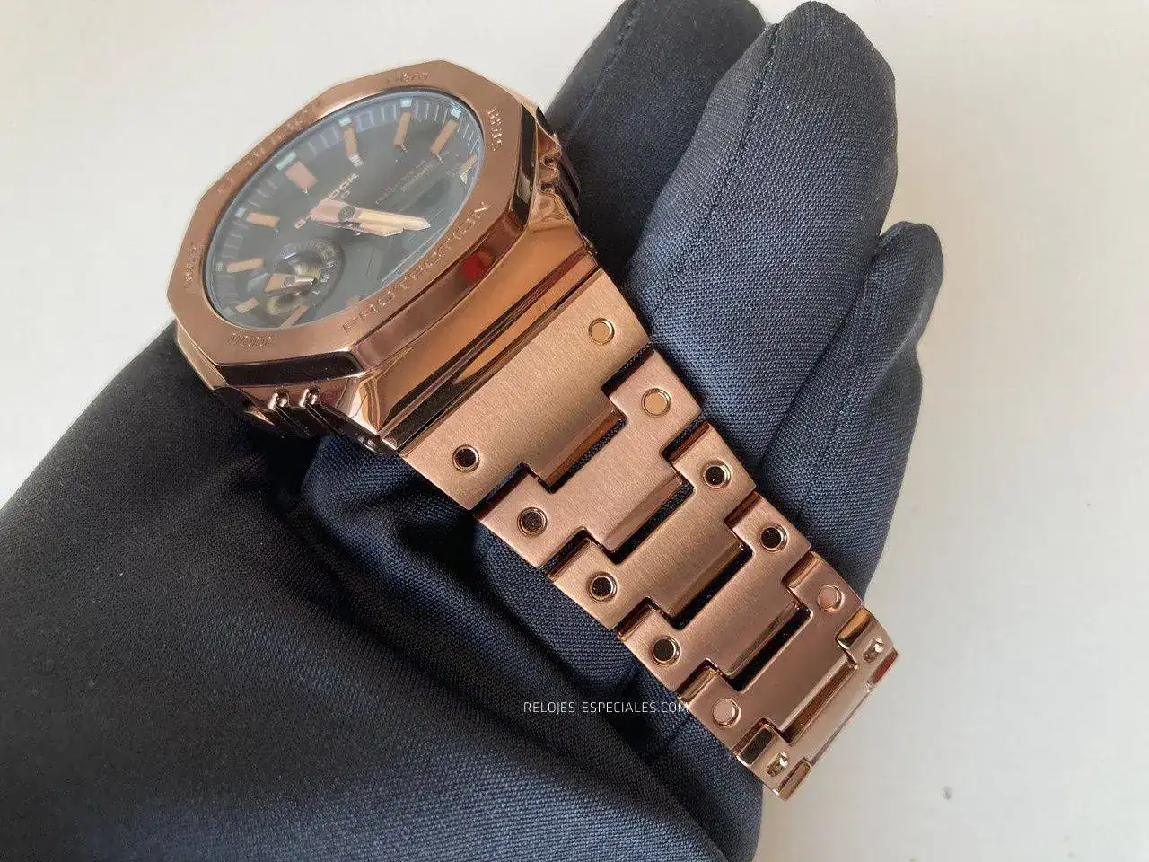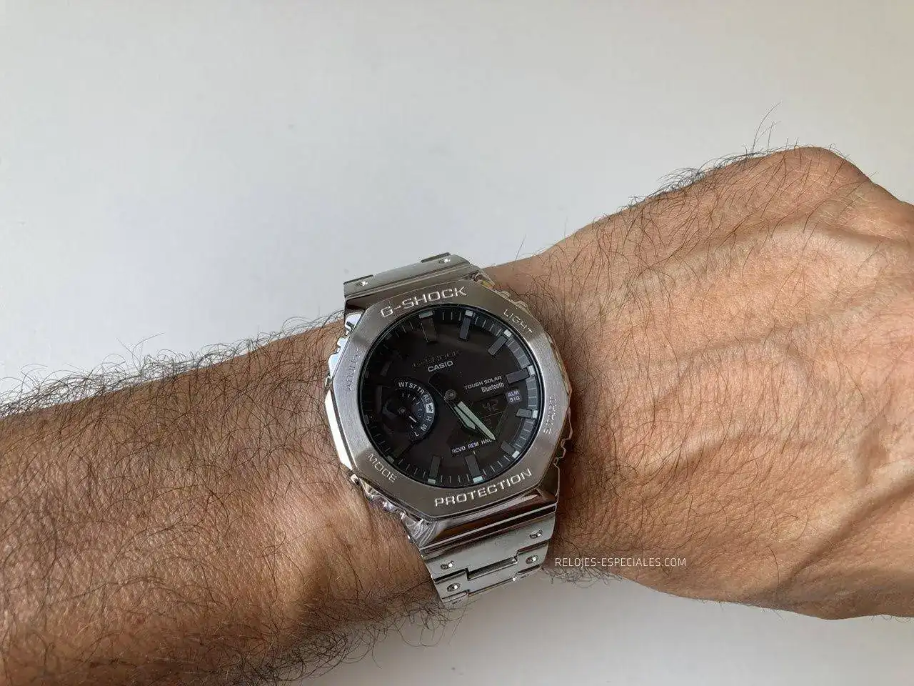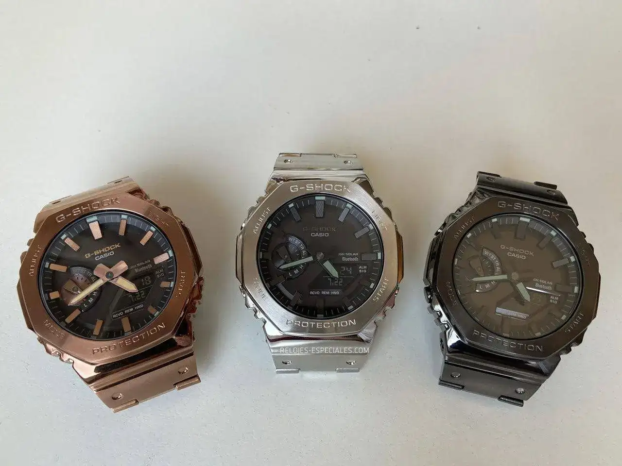Tal vez sea por esto (y porque ya ocurrió con el DW-5000, que se "ironmaizó" en el GMW-B5000 X-ER) Casio presenta hoy el GM-B2100. Caja y brazalete completamente en acero incluyendo el fondo -roscado- y en tres tonos: acero, "gun metal" y oro rosa (o "silver", "all-black IP" y "rose gold IP", como los han denominado en inglés). Aunque la diferencia no se queda aquí: el nuevo GM-B2100 mantiene su esbeltez gracias a la tecnología Tough Solar (alimentación solar) y gracias al nuevo módulo 6591 añade la característica de la conectividad Bluetooth que lo vincula al smartphone, garantizando la precisión, ya que se conecta al teléfono hasta cuatro veces al día. Pulsando un botón grabará la hora y la ubicación respecto a un mapa y se pueden configurar hasta cinco alarmas diferentes. Ah, y puede localizar tu teléfono si lo pierdes por casa. El anillo de carbono entre la caja de acero y el módulo (el Core Guard) garantiza la característica G-Shock protegiendo a este último de todo tipo de golpes y caídas.
