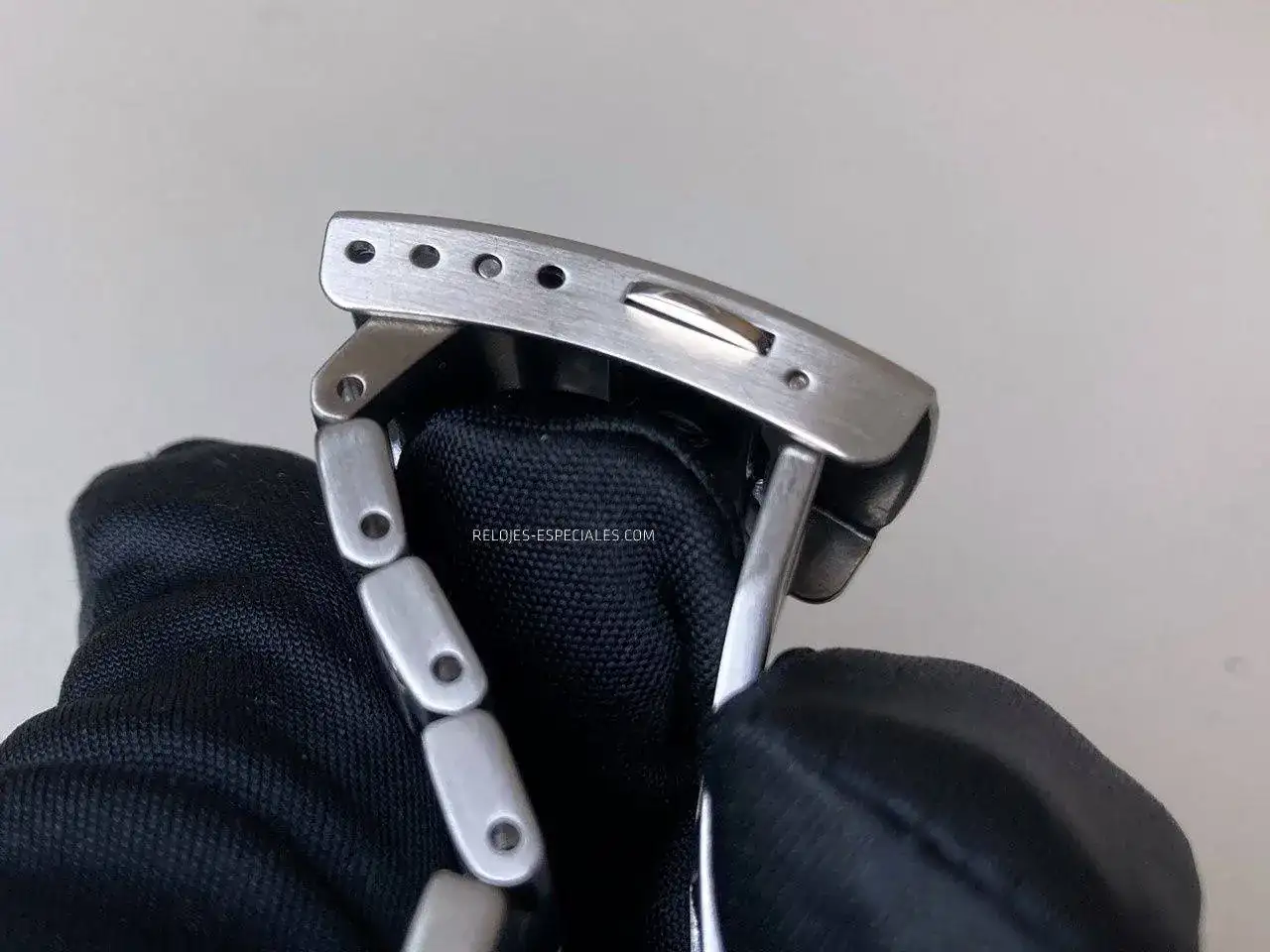 Para ajustar el brazalete a la medida del usuario se puede "jugar" con los agujeros laterales de este cierre y el medio eslabón colindante, pero no dispone de ningún micro-ajuste digamos automático (esto es, accionable con el reloj puesto)