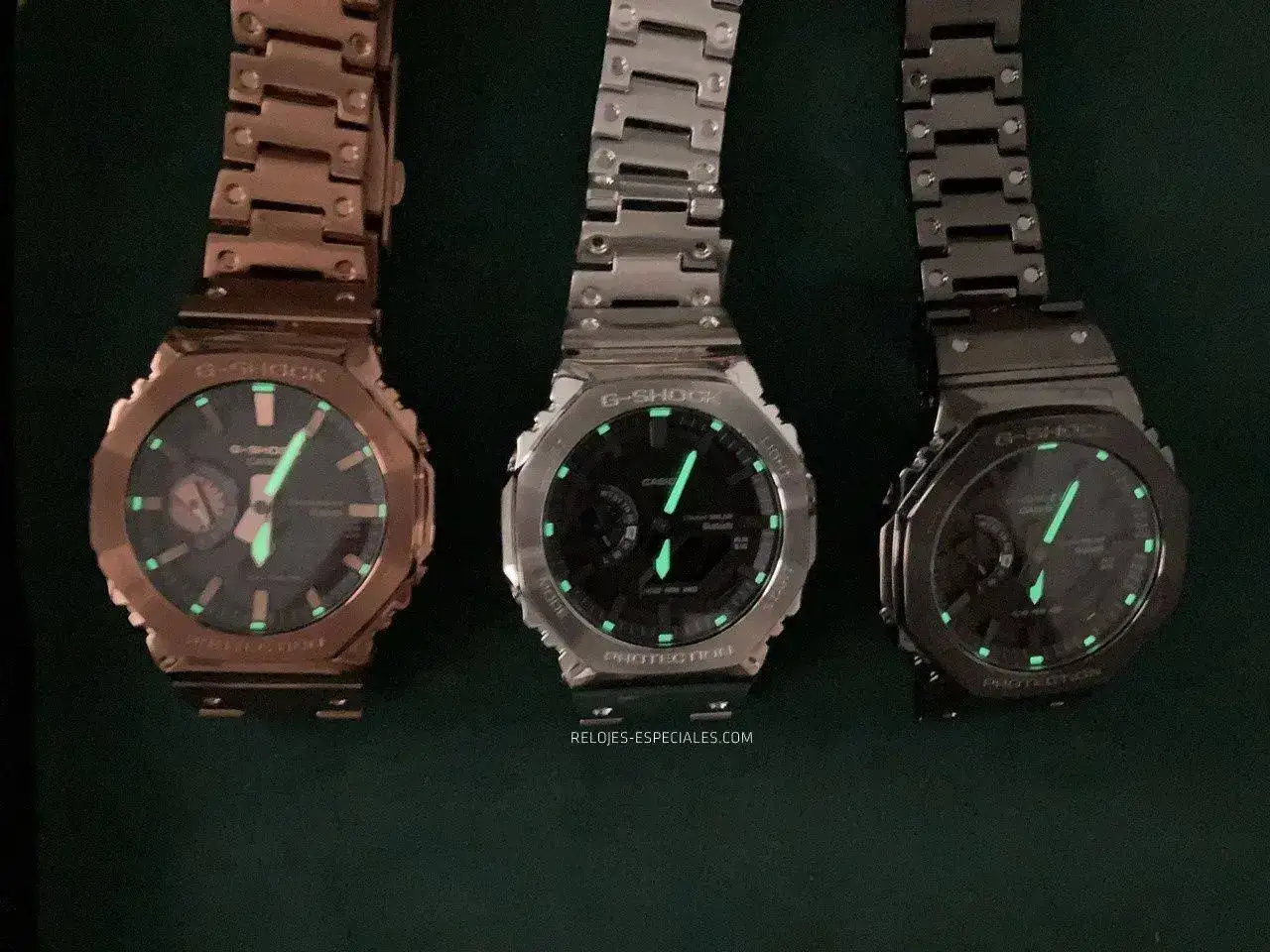 El "Red Gold" es el único de los tres que tiene el cristal "claro", en tanto los otros dos presentan cierto "ahumado" que, si bien contribuye a un aspecto más deportivo, no favorecen la legibilidad. Lo mismo cabría decir de las manecillas horaria y minutera, que al tener el mismo color que el fondo de la esfera parecerían más pequeñas. Nada grave, en todo caso, porque el material luminiscente destaca lo suficiente.