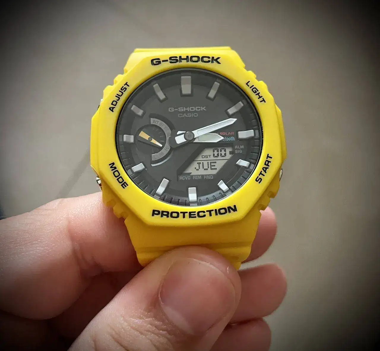 No sé si el hecho de tener un bisel octogonal es casual o no (Casio dice que mantiene el ADN del DW-5000, que también tiene una caja de ocho lados). El hecho de que se le haya denominado CasiOak demuestra que al menos a los aficionados no se les ha escapado la coincidencia. Por otra parte es obvio que con el GA-2100 Casio nunca pensó en competir en esa super-liga, pero no sería de extrañar que hubiera apostado por un aspecto que la mayoría tiene identificado como "clásico" ni que sea de forma inconsciente. Eso explicaría que el "CasiOak" trascendiera tan fácilmente los círculos habituales de aficionados a la marca habiendo diluido un poco su característica de reloj-herramienta puro, algo a lo que tampoco es ajeno el hecho de que sea un "ana-digi", compartiendo manecillas y display digital en la misma esfera.