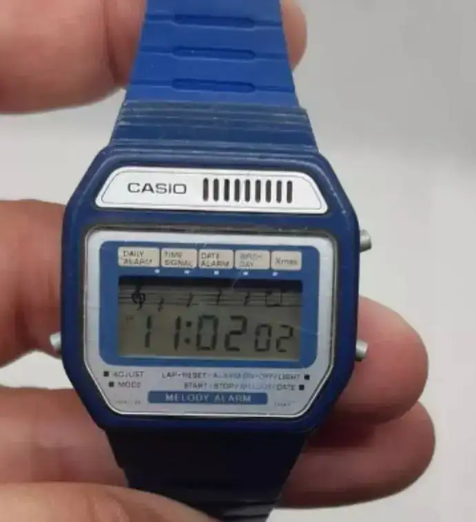 allá arriba, en la frontera con Francia. Así que un finde, subimos al Simca 1200 del amigo Salva y tiramos pa Andorra (el recurso de compra de importación de los españolitos de entonces). Y en una tienda lo ví. con su LCD (entonces aún se veían novedosos) con los segundos "flotando", y ese diseño con la guitarra frontal y el "12 melodías". El vendedor me dijo "es un modelo nuevo" y yo no pude evitarlo, pese a las (aún lo recuerdo) cuatro mil y pico pesetas (que era mucho entonces....)