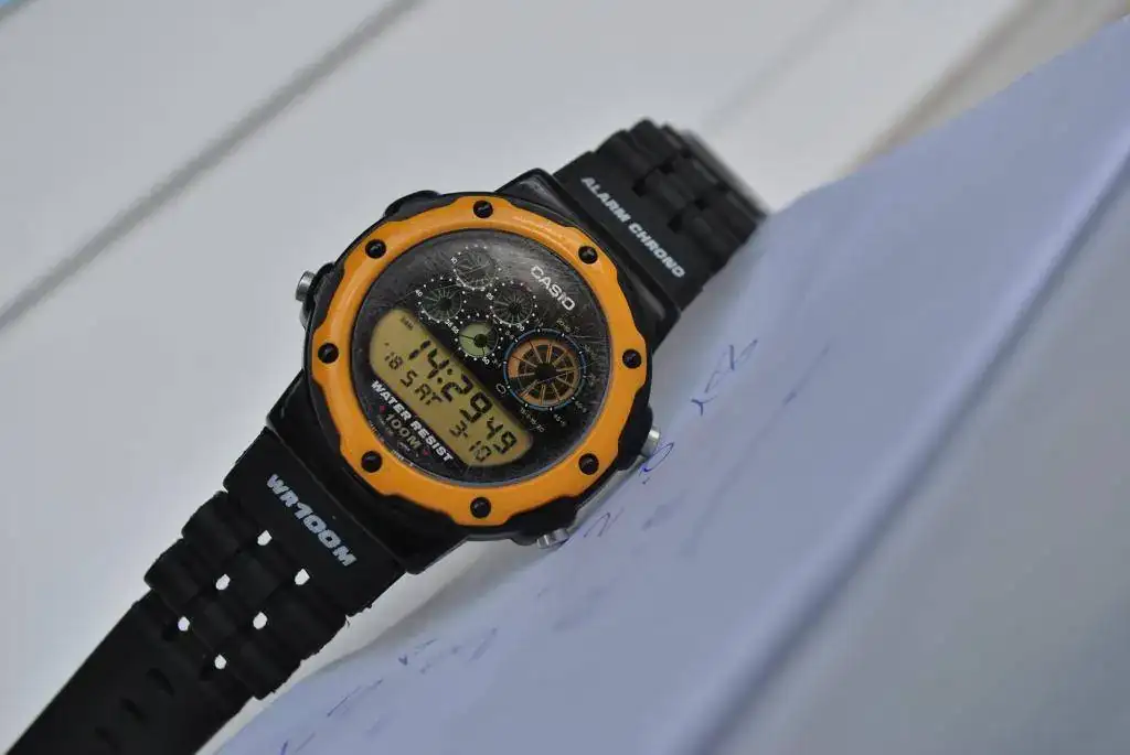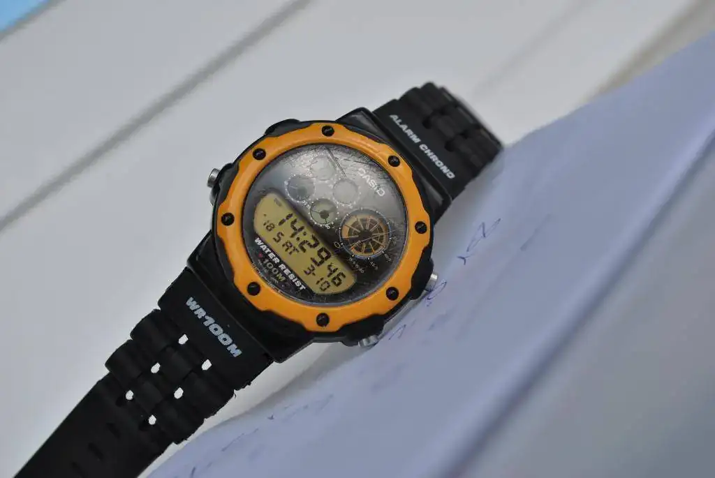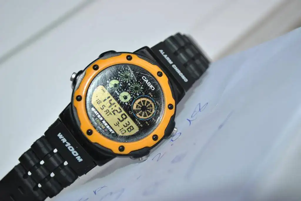 Vendo este CASIO ochentero, con bisel amarillo. Pentagraph. PGW-30. Usado y con signos de uso en cristal.Caja, en estado muy decente para el porrón de años que tiene. Funciona perfecto, todas sus funciones operativas.Correa aftermarket, muy,muy parecida a la original.