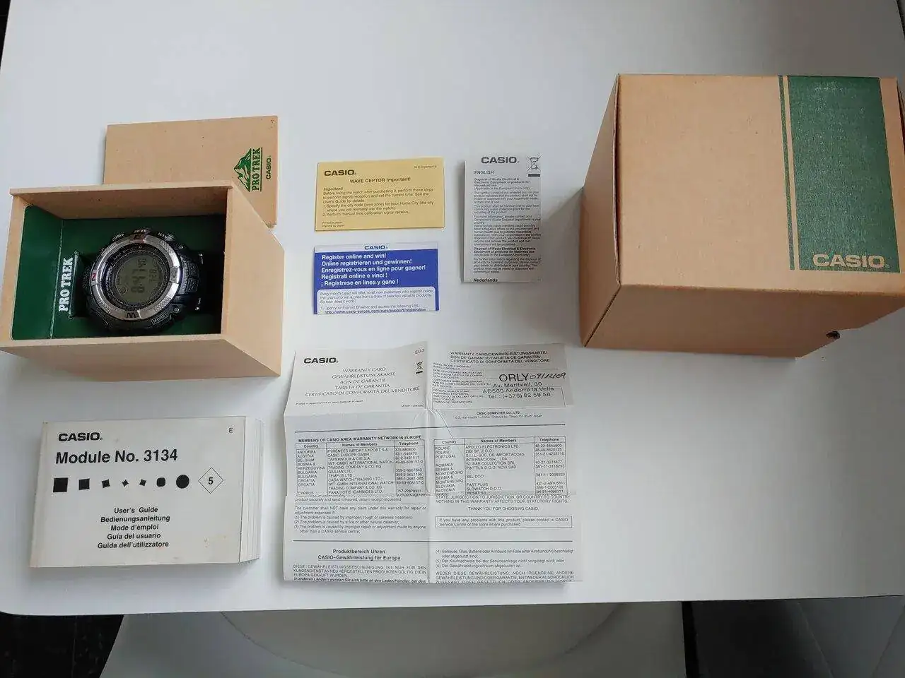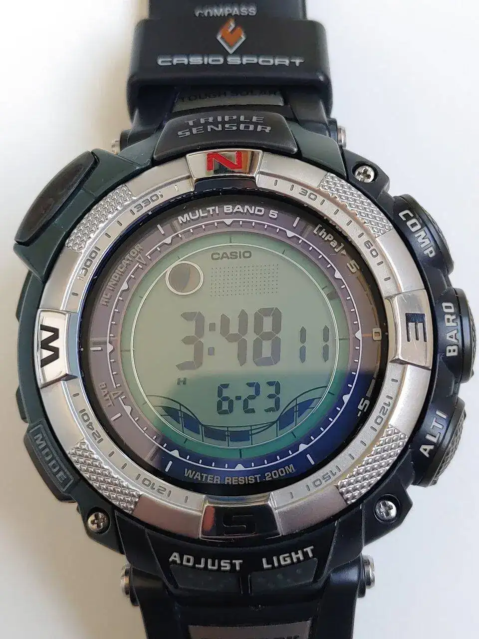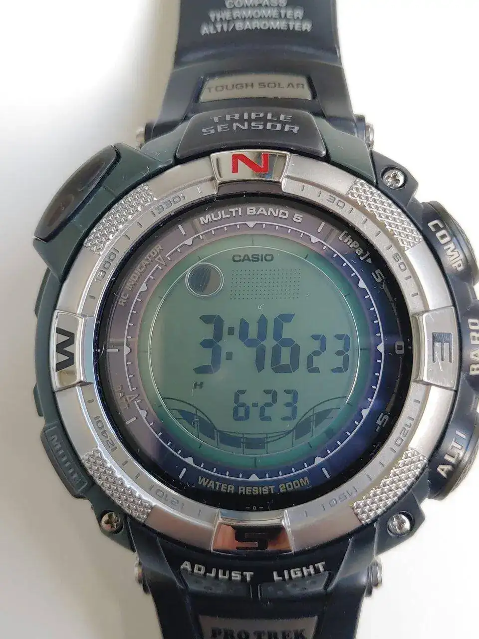 Pongo a la venta este Casio Pro-Trek 3134 PRW – 1500 1VER. El reloj ha sido utilizado en contadas ocasiones para practicar deporte. Tiene algún rasponcillo en la correa de resina y en el bisel (punto cardinal Este / E), pero en general está en muy buen estado –no he conseguido ver nada más--. Las funciones son muy completas y podéis echarles un vistazo en este enlace: https://www.baroli.es/reloj-casio-pro-trek/prw-1500/