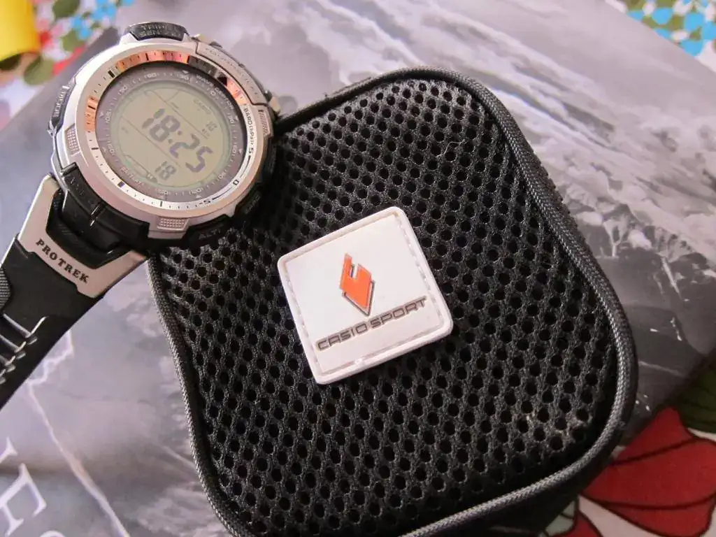 Caja:SI. La caja es una bolsa de viaje negra aconchada Casio Sport (es la caja original). Se vé en alguna foto.