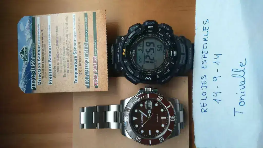 pongo a la venta esta casio sin apenas uso,tiene su caja ,sus papeles ,esta completo y sin apenas uso,me lo he puesto un par de veces no se ni como funcina ,le doy a los botones y funciona pero no lo entiendo, ni ganas de entenderlo no es lo mio.+de regalo un parnis sub ceramico color burdeos,tambien casi sin uso.precio antiregateos 110e envio certificado.cualquier duda m.pgracias ,un saludo