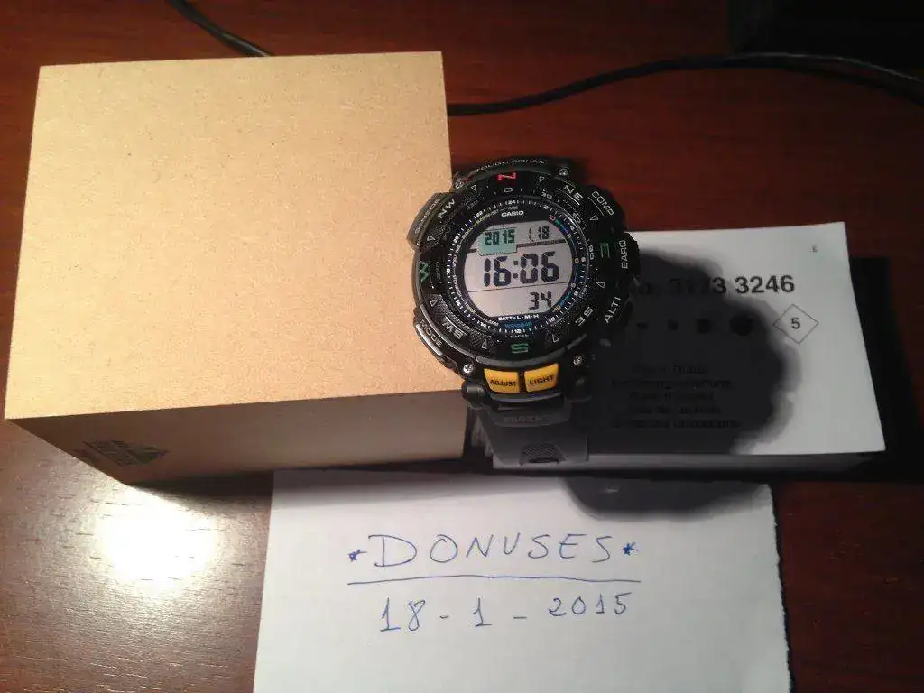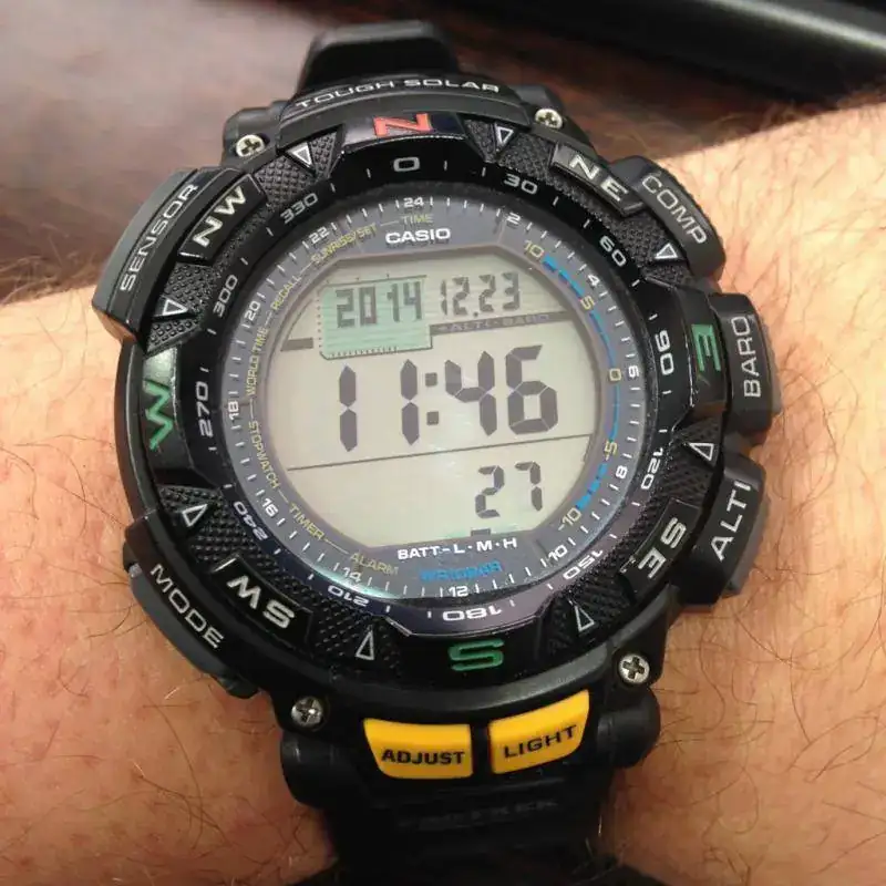 Es el modelo que tiene ALTIMETRO, BAROMETRO, TERMOMETRO, BRUJULA DIGITAL, VARIAS ALARMAS, SALIDA Y OCASO DEL SOL, HORA DE VARIOS PAISES, no usa pila, recarga por energía solar, sumergible 10 bar.