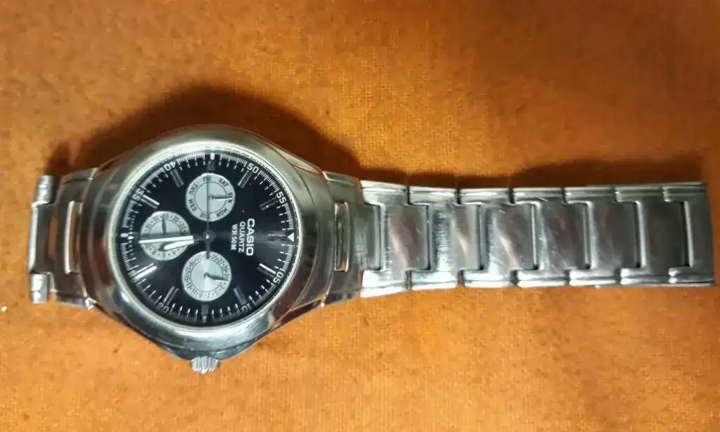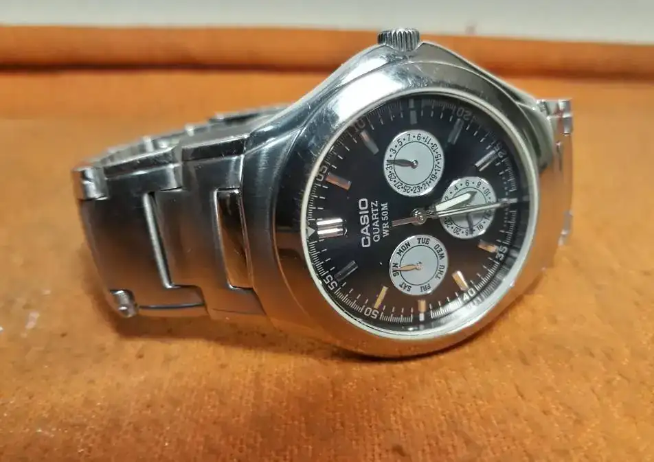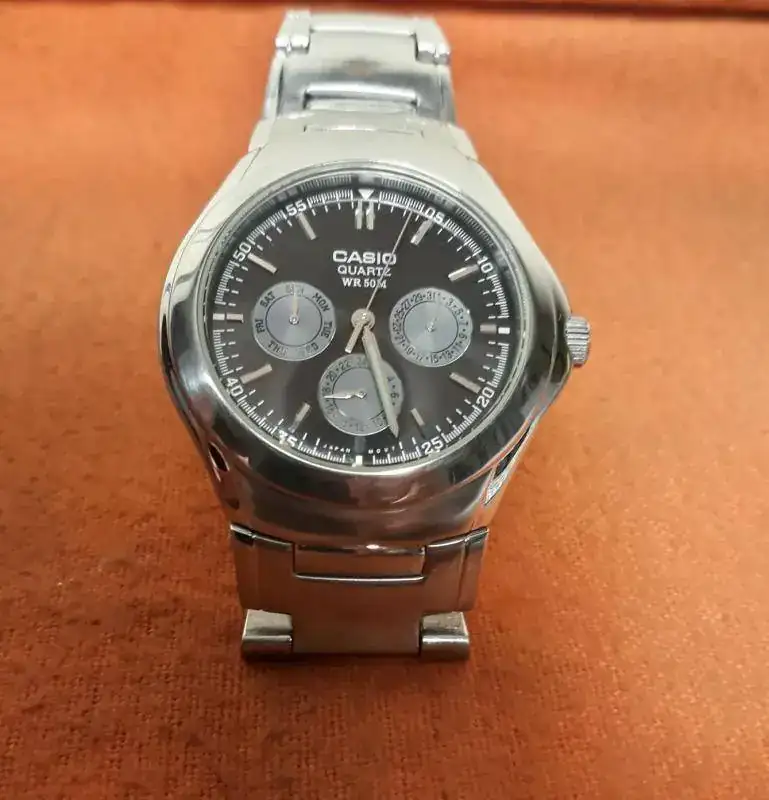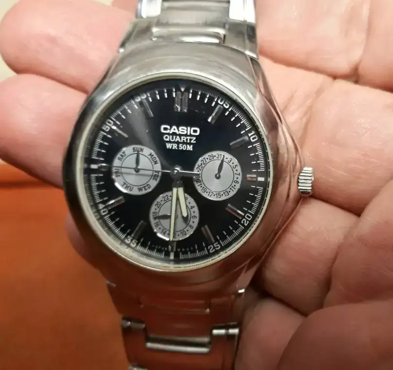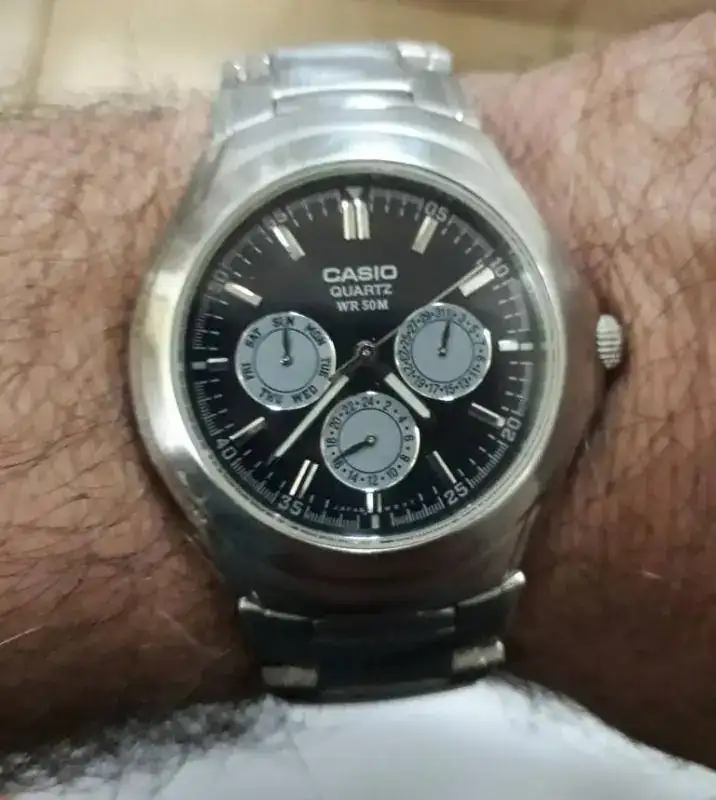 Les comparto mi Casio 1247 movimiento 1343 que adquirí recientemente en internet ,muy maltratado estéticamente deteriorado que restaure mediante pulido con pasta dental,lija al agua y oxido de cerio , funciona muy bien,lo compre a un muy buen precio pero me tomo mucho tiempo de restauraciónbcon muchas rayas y golpes,no se de que año es ,pero si algún compañero forista me puede brindar información se agradecerá,parece una maquina muy robusta de excelente funcionamiento
