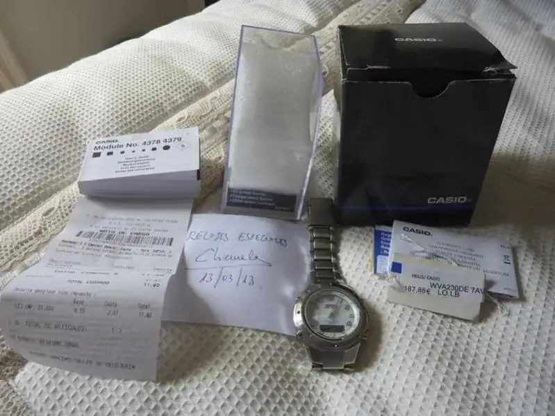 Pongo a la venta un Casio WVA-230DE-7A. El motivo es porque lleva más de un año sin uso en un cajón. El pasado sábado día 9 de marzo se sustituyó la pila (adjunto copia de ticket).
