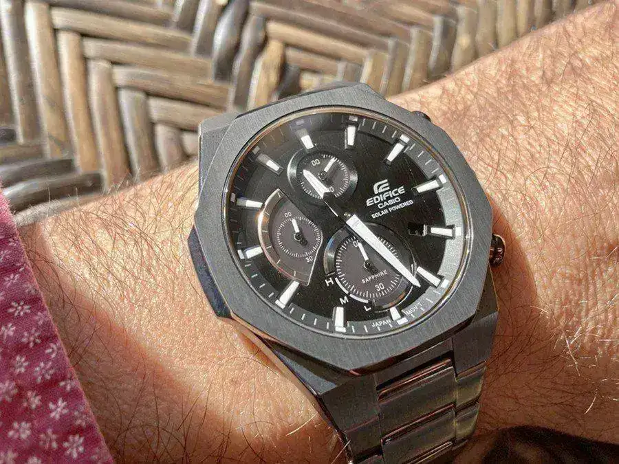 El Edifice EFS S570 está alimentado por energía solar, por lo que se podría decir que -a menos que vivas en los Polos o cerca- no tendrás que preocuparte por el suministro de energía. La célula fotovoltaica está integrada bajo la esfera, de manera que sólo sabemos que es solar precisamente por la leyenda en esa esfera: "Solar Powered". Monta el módulo 5634 que, además de la hora y la fecha, ofrece un cronógrafo con tiempos intermedios -versión electrónica de un ratrappante- capaz de totalizar una hora, perfecto para controlar un parquímetro o la cocción de los spaghetti, pero no para ver crecer la hierba. Curiosamente, una vez transcurrida esa hora el crono se detendrá. La disposición de las subesferas es similar a la de un Valjoux 7750 salvo porque no tiene trotadora central: segundos y minutos del crono en 12 y 6, respectivamente, y segundos continuos a las 9. Como información adicional también permite ver el estado de carga de la batería: en el contador de minutos a las seis aparecen las indicaciones H, M y L (High, Medium, Low). La ventana de fecha, a las 4, muestra un disco del mismo color de la esfera con cifras blancas.