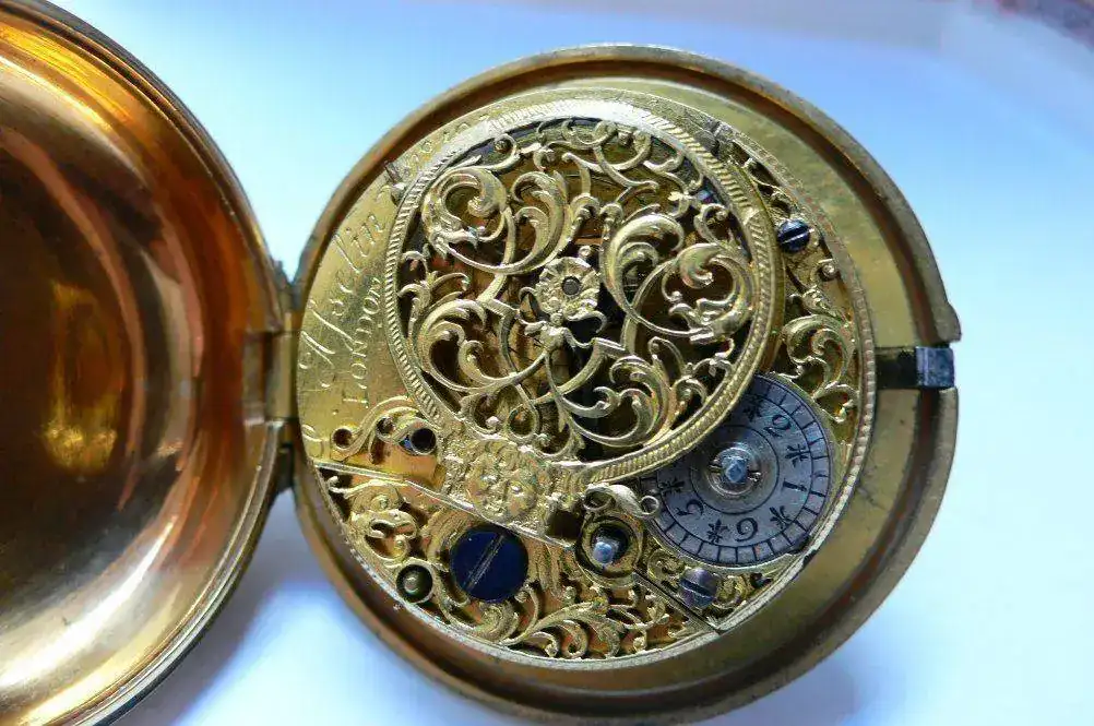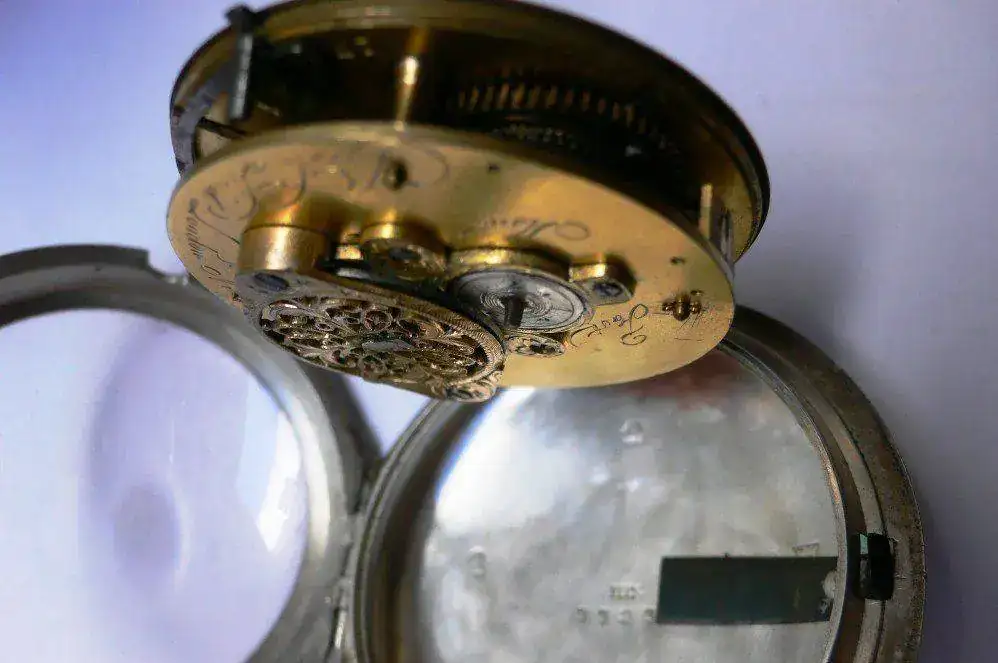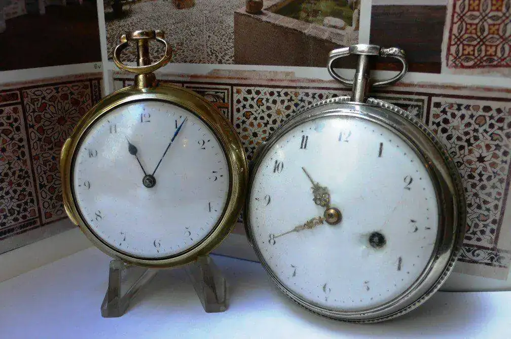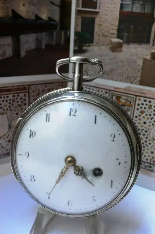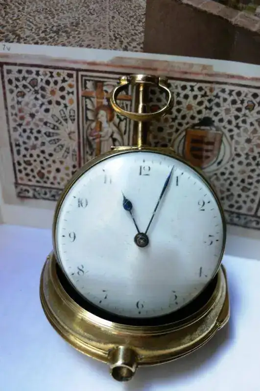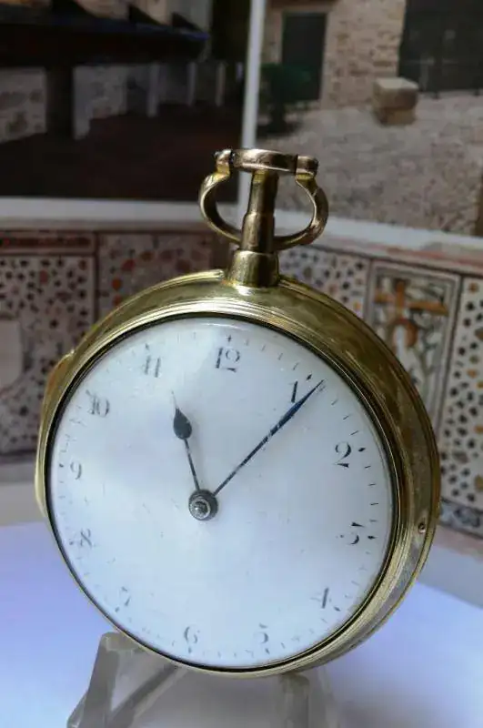 Presento en sociedad un reloj inglés de escape Catalina - Verge - Coq , esfera de esmalte , numeros arabes , caja de metal (aleación de cobre) , las agujas claramente no le pertenecen (ya lo solucionaremos).