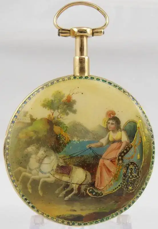 Caja en oro de 18k con sonería a cuartos y sonería sorda. Con fuerte decoración en toda su caja con esmalte multicolor. Campana en acero para la sonería, en tapa interior. Aperturas por todo su perímetro, para dejar escapar el sonido. Aro de perlas, en la esfera. ESFERA: Convexa con esmalte blanco sobre cobre, numeración árabe para las horas, los minutos están indicados. Agujas tipo escarabajo en oro, con firma del fabricante. MÁQUINA: En latón dorado, con galluza profusamente decorada Regulador de velocidad de sonería, adelanto y retraso sonería a cuarto, con dispositivo, para convertirla en sorda. Dispone de tres pivotes, uno, para el estado de marcha, otro para la sonería y el tercero para la regulación. Número de serie. 11646.