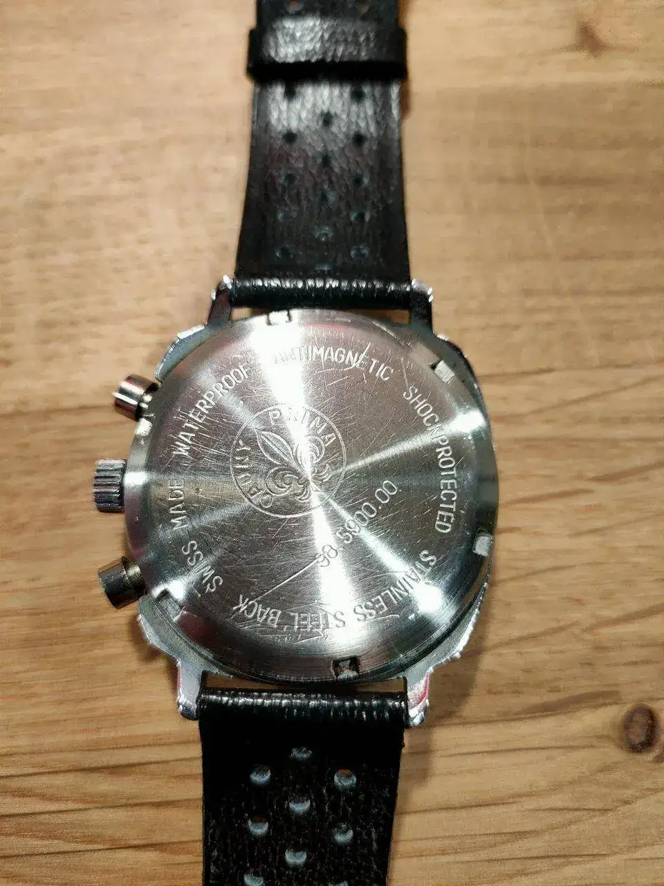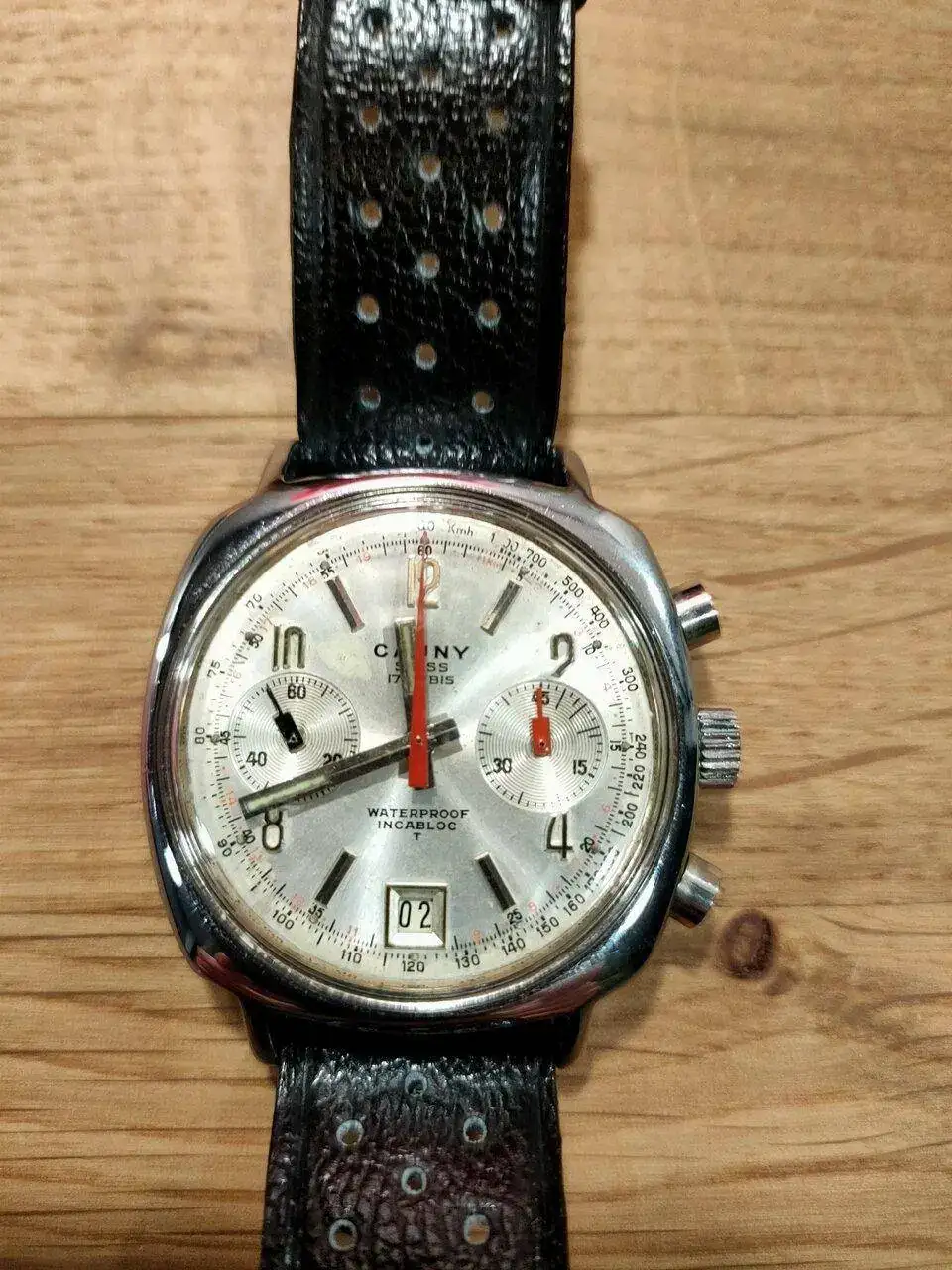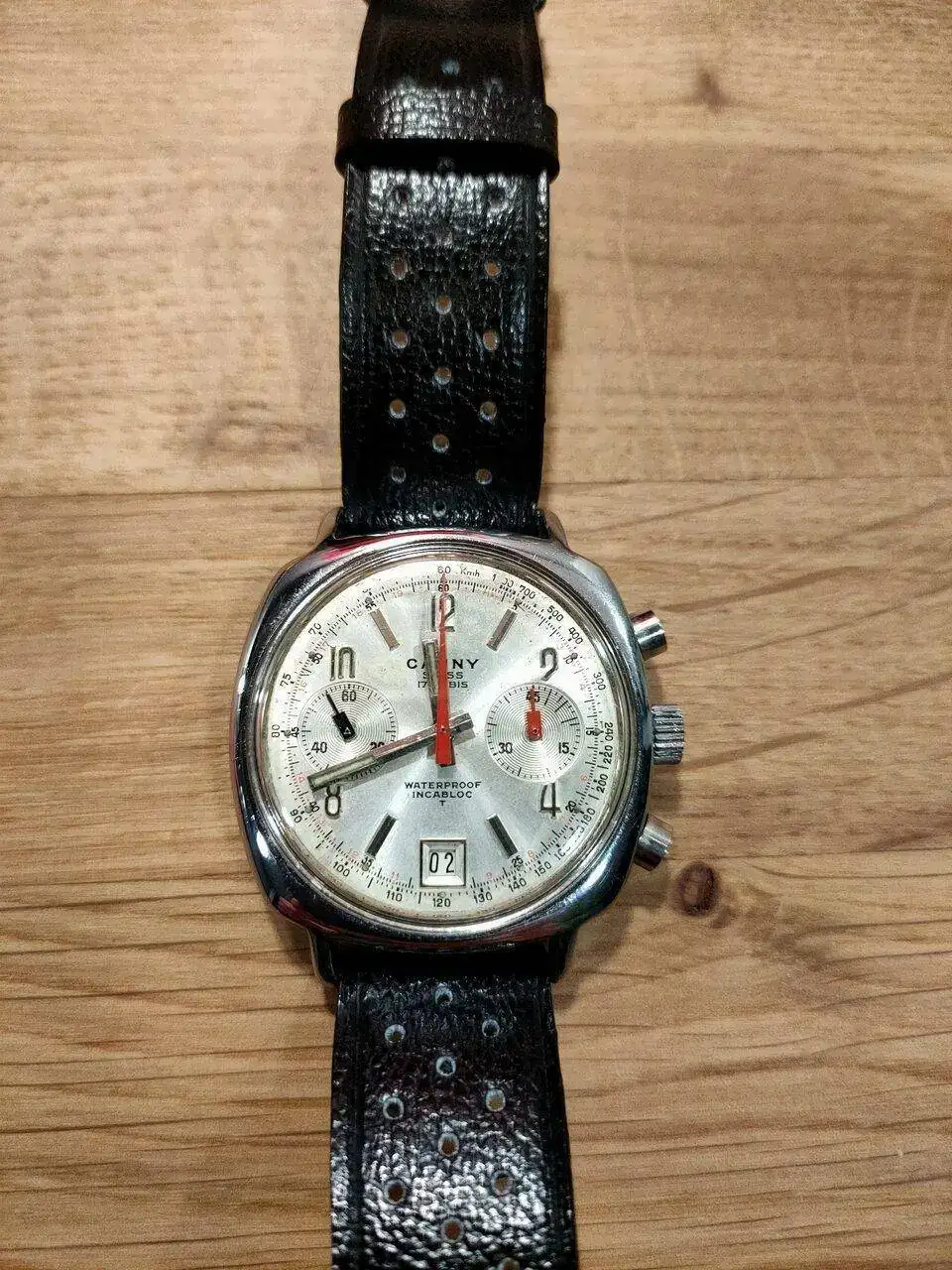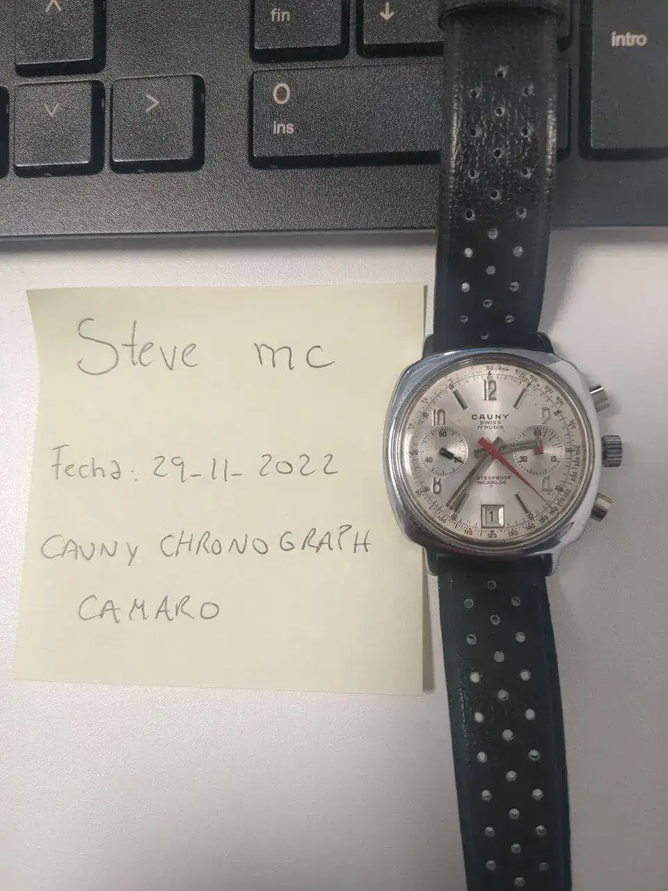 Pongo en venta este Cauny Chronograph Camaro de los años 70,con caja de acero tipo cojín de 38'5mm, con una máquina de lo mejorcito, una Valjoux 7734, la misma que llevaban los Heur y los Breitling de la época, resetea perfectamente y suena de maravilla, lleva una correa nueva de piel tipo Heuer Carrera, original de la época de la marca Longines con el logo en el bucle. Está claro la influencia del Heuer Camaro de la época en este modelo... Es un crono bastante inusual y está en excelentes condiciones.
