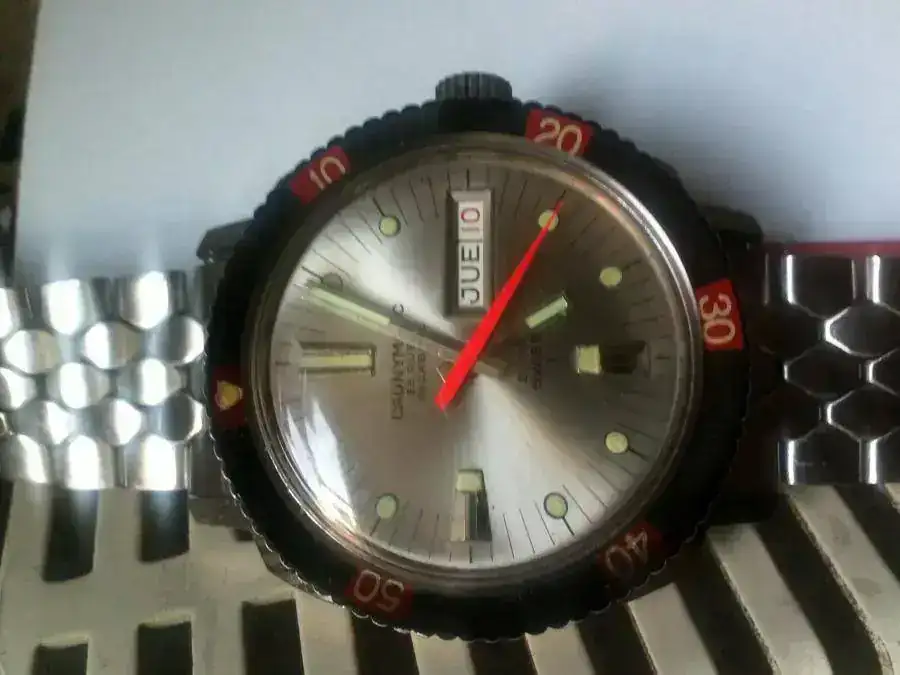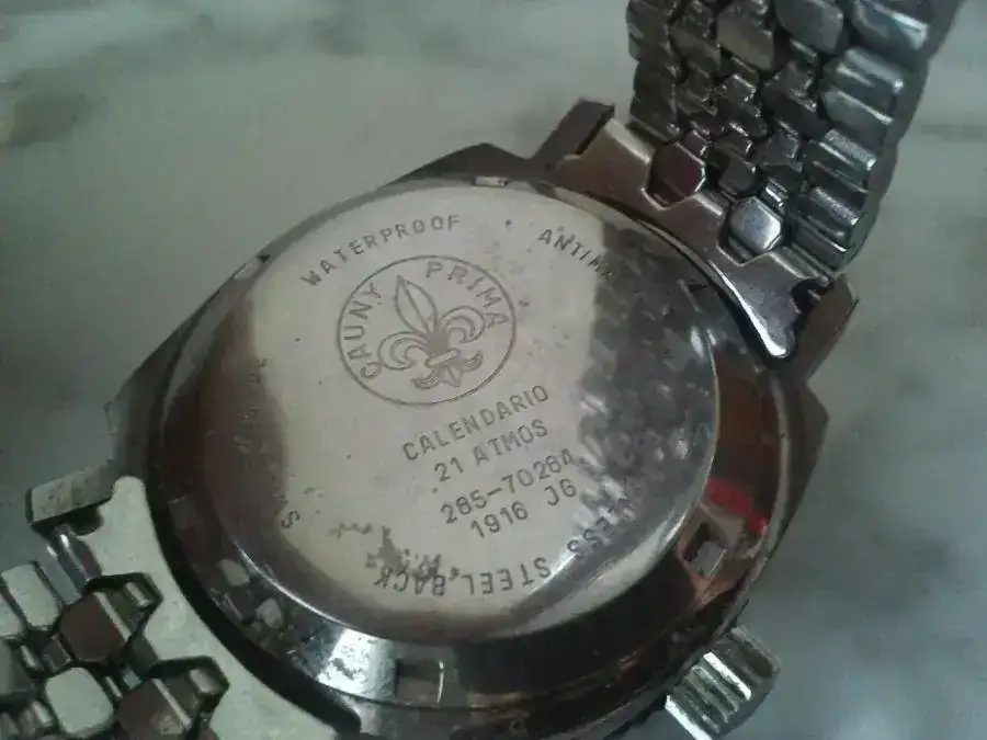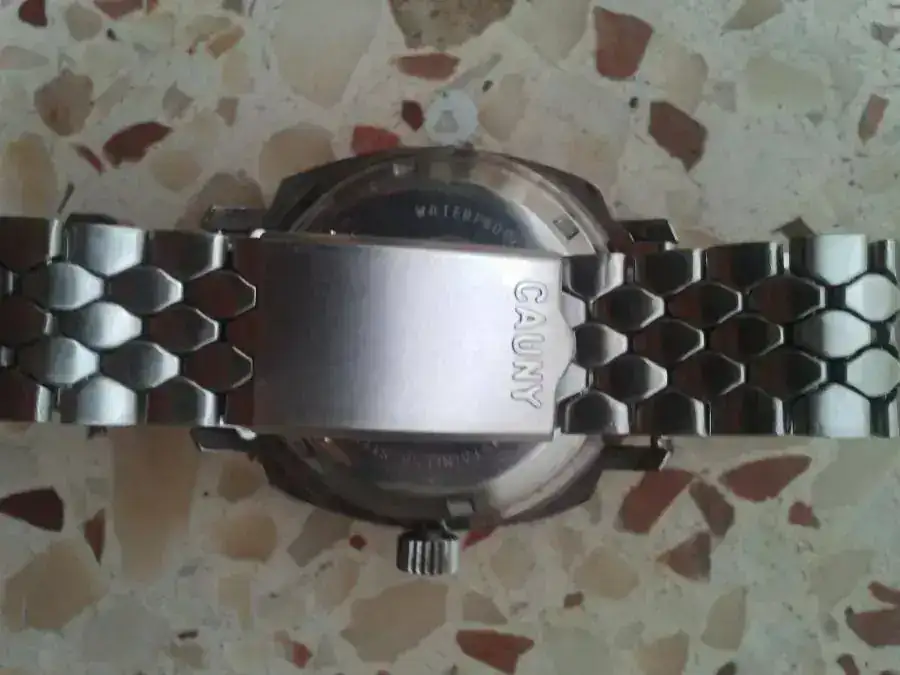 Lo dicho compis saco a la venta este fabuloso Diver Cauny de 1968,con un tamaño de caja como de corona bastante generoso para la epoca,38mm de caja sin contar corona.En su dia se vendia indicando su sumergibilidad a 210 metros de profundidad,algo impensable para este reloj en la actualidad.Su maquina es automatica y es la AS 1916,en su version mas alta 25 rubies,revisado y aceitado hace apenas 3 meses asi que funcionando correctamente.Ademas viene entero de origen tanto armis como corana y bisel , la verad que en muy buen estado de conservacion,por eso le marco un precio de 150 euros dando prioridad a la entrega en mano en Bcn con las cañas a mi cargo.