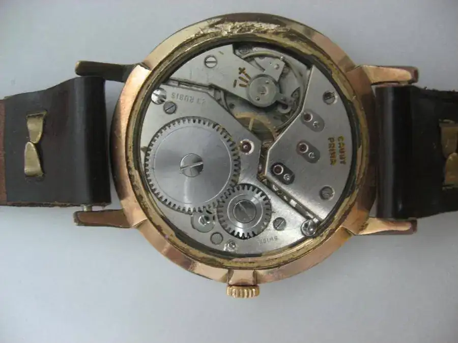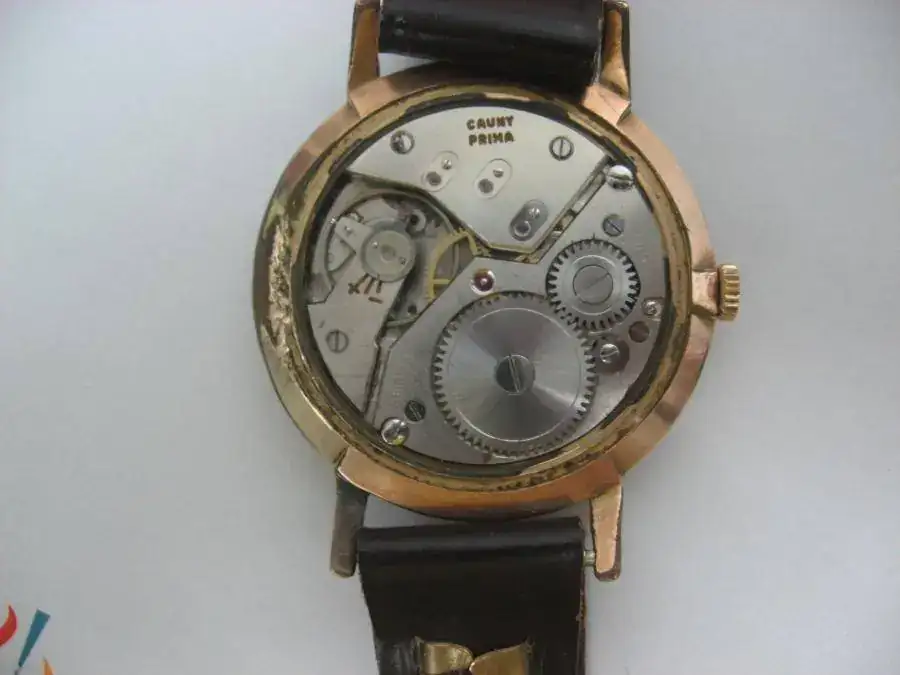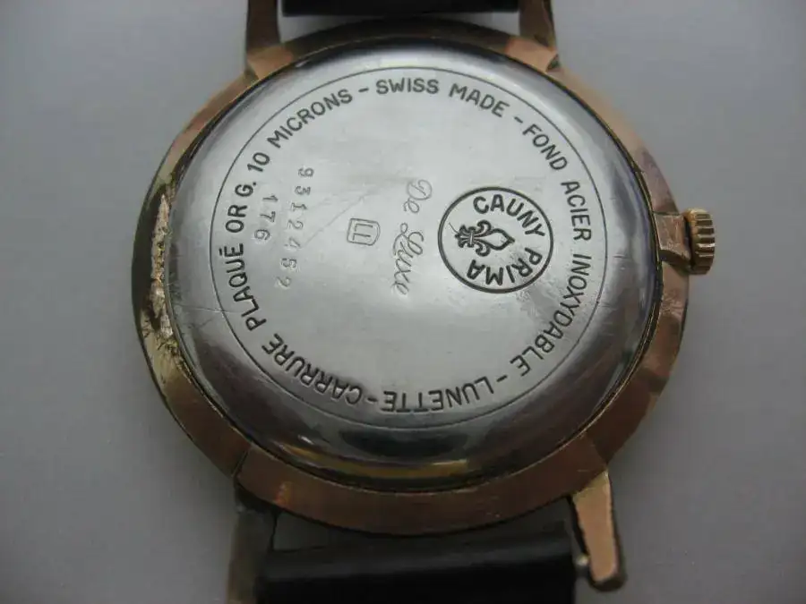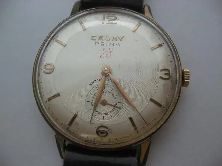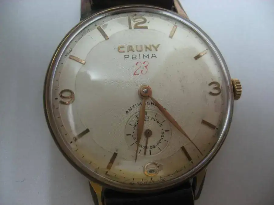 El siguiente en salir es este Cauny Prima 23. El 23 es por 23 rubís aunque según leí en el foro algunos son inútiles (política comercial) Las fotos exageran el estado de la caja ya que salvo la hendidura para quitar la tapa el resto solo presenta desgastes propios de su edad. La caja es de unos 38mm chapada en oro 10 micras. La tapa es de acero como es habitual. Ha sido revisado recientemente. La esfera está muy bien salvo algunas manchas, NO estando restaurada. Comentar que no fui capaz nunca de quitarle los pasadores por lo que le puse una correa de grapas, un poco más joven que el reloj, pero con mucha vida por delante. El movimiento es un Unitas 176 como ya dije de 23j con una marcha aceptable (adelanta un poco).