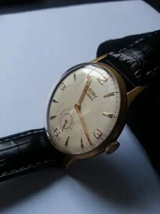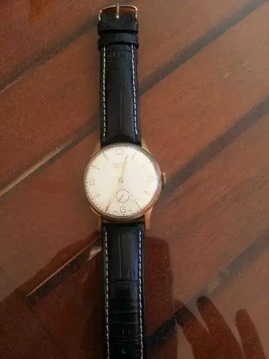 Hola compañeros. Saco para venta este precioso Cauny Prima "Big size". Como digo es grande para la epoca 38mm sin contar corona, y al carecer de bisel queda un tamaño muy actual. Revisado hace poco mas de un año y esfera restaurada, se encuentra en un estado magnifico tanto estetico (mirar fotos) como de marcha. Correa de piel practicamente nueva, con ardillon dorado. El que busque un vintage, en buen estado y de con medidas actuales, este es su reloj. Ahora unas fotos para que veais su buen estado.