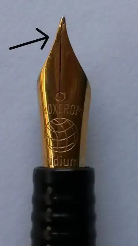 Esta foto no es tan ilustrativa, pero les comento que es digamos, una deformación... vamos, si colocamos la pluma horizontalmente, la punta del plumín parece tener la forma de una onda de mar, aunque la curvatura no es tan pronunciada.