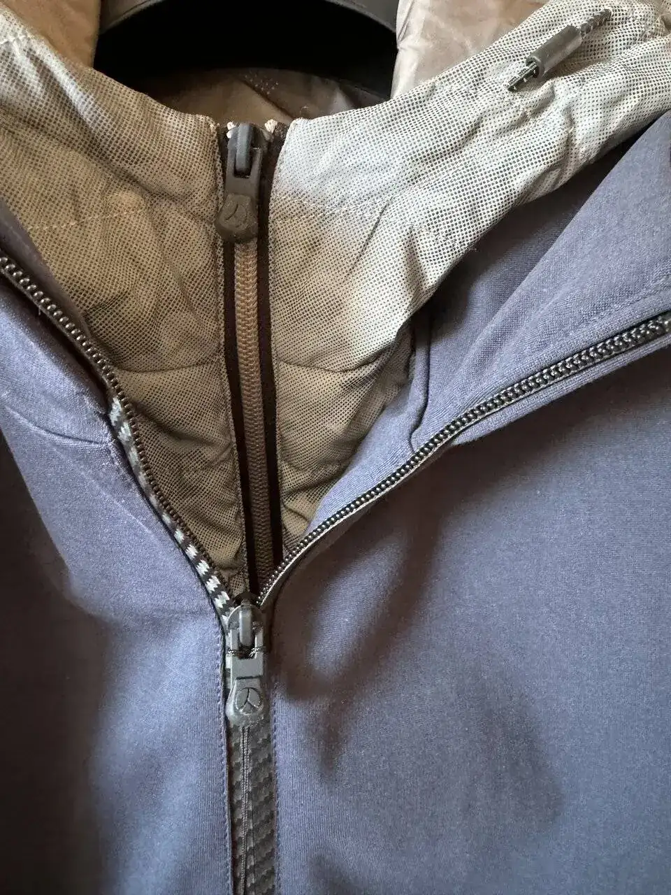 La más espectacular es la de la marca italiana People of Shibuya, solo probada y a estrenar, de una calidad sublime. Es comodisima y muy estiliza. Una especie de híbrido super versátil que puedes utilizar como cazadora o como sudadera, con detalle en el percherín y capucha espectacular en primaloft con 2 cremalleras, en realidad 4 para poder abrir por debajo también. Combina varios tejidos técnicos, es una auténtica pasada y queda genial ya que es muy versátil y te permite llevar desabrochada la parte azul y el interior abrochado a tu gusto. Tiene detalles reflectantes también.