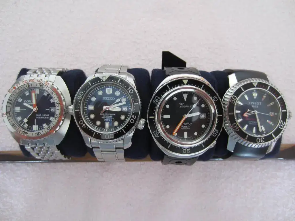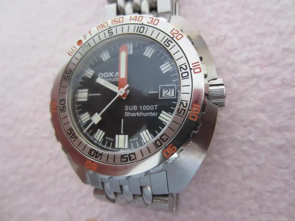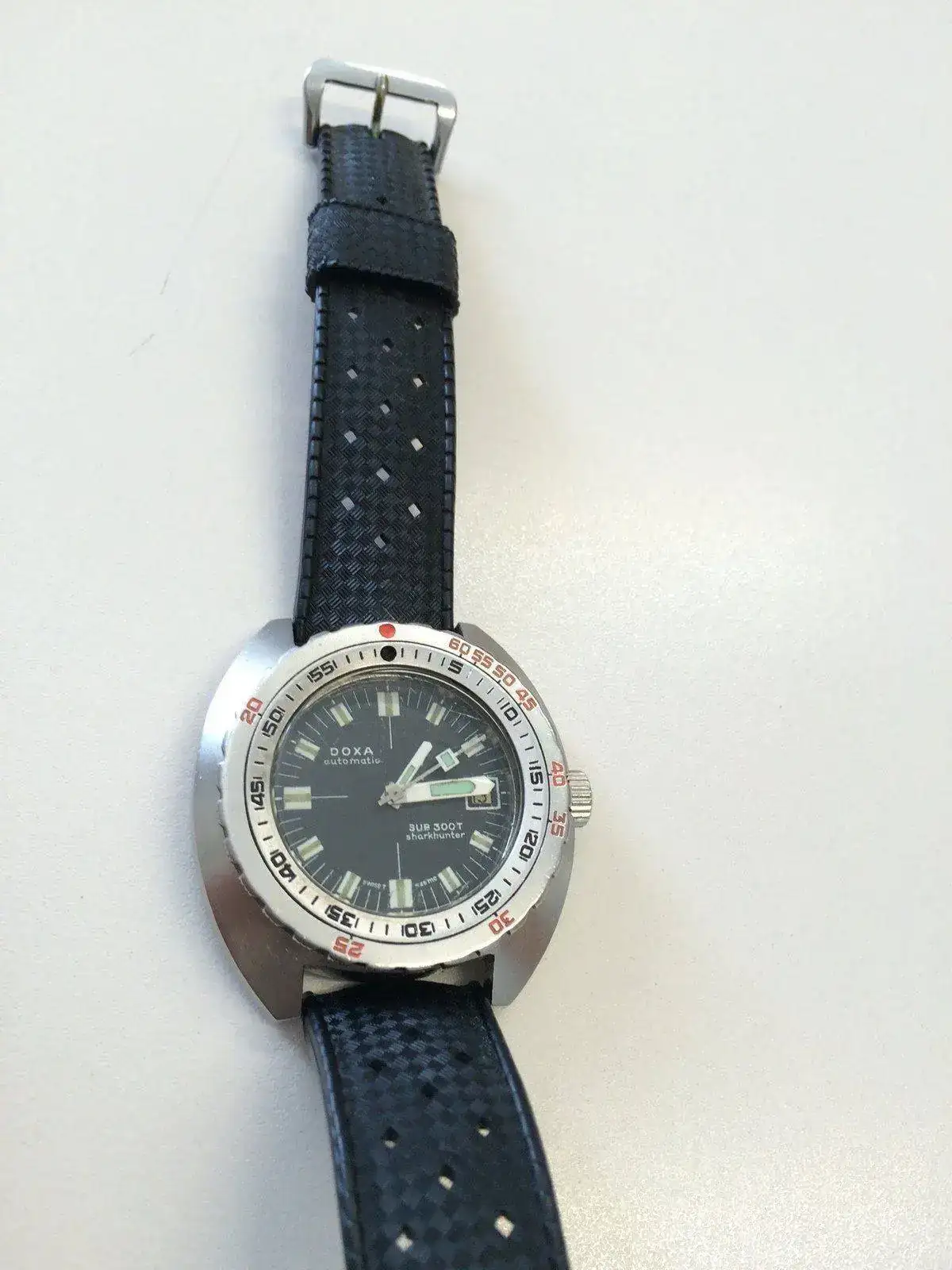 Muchas gracias! Doxa es probablemente mi marca preferida, junto con Certina si nos referimos a buzos añejos. Años llevo coleccionándolos, aunque la variedad de modelos hace casi imposible adquirirlos todos. Por ejemplo, de los 300, sólo tengo el Blacklung, aunque de todos ellos el más raro, con sólo unos 13 datados en todo el mundo hasta la fecha, aunque creo que alguno más habrá ya que no creo que sean prototipos como mucha gente dice. Y del los T-graphs, el trio, otro grupo muy difícil de ver en conjunto.En cuanto a tu silver sharkhunter, en mi opinion, sigo pensando que puede ser una referencia cruzada y no un reprint. Lo de las agujas igual es más dudoso. Es sabido que Doxa hizo variaciones en sus diseños, ya no sólo desde el principio, sino también cuando fue absorbida por el grupo Synchron. Se conocen referencias sharkhunter con dial naranja, como aparece en el libro de Miller, e incluso un sharkhunter con la referencia Cyma. Obviamente, es sólo mi opinion pero viendo la leyenda del tuyo no me parece hecha a posteriori.Una magnífica pieza en cualquier caso y contento de que también esté en esta familia de RE.Un saludo!Hola Cesar.. y compañía!Respecto al "silver sharkhunter " no tengo mucha información.. la verdad!Es adquirido en USA mediante una subasta sin información ni papeles..Como bien dices, podría ser una referencia cruzada, ya que he visto algún otro ejemplar de sharkhunter plateado, los cuales deben ser errores de fabricación o ediciones de prueba, o prototipos..Este ejemplar es para mercado americano, por el bisel en feets y logo aqualung, y de los primeros ejemplares del 68' ya que tiene doble círculo en el grabado del barco, de la tapa trasera.Otra hipótesis sería el dial repintado o substituido, ya que me despistan las agujas negras, que serían propias de un 300t profesional.En los searambler como bien sabéis, el minutero es naranja, y en otros sharkhunter plateados, también aparece en naranja.. de ahí las dudas..Hecha esta misma consulta en foros especializados y a expertos coleccionistas de Doxa, comparten también esta hipótesis.. También me gustaría conocer tu opinión Cesar, ya que tus conocimientos y colección son espectaculares!!En definitiva.. tengo un bicho raro, pero tiene un aspecto precioso.. aunque me decanto por mi sharkhunter negro, del cual estoy enamorado!Gracias por leer y por vuestros comentarios!Y Cesar, enhorabuena por tu colección.. tiene muchísimo mérito!!