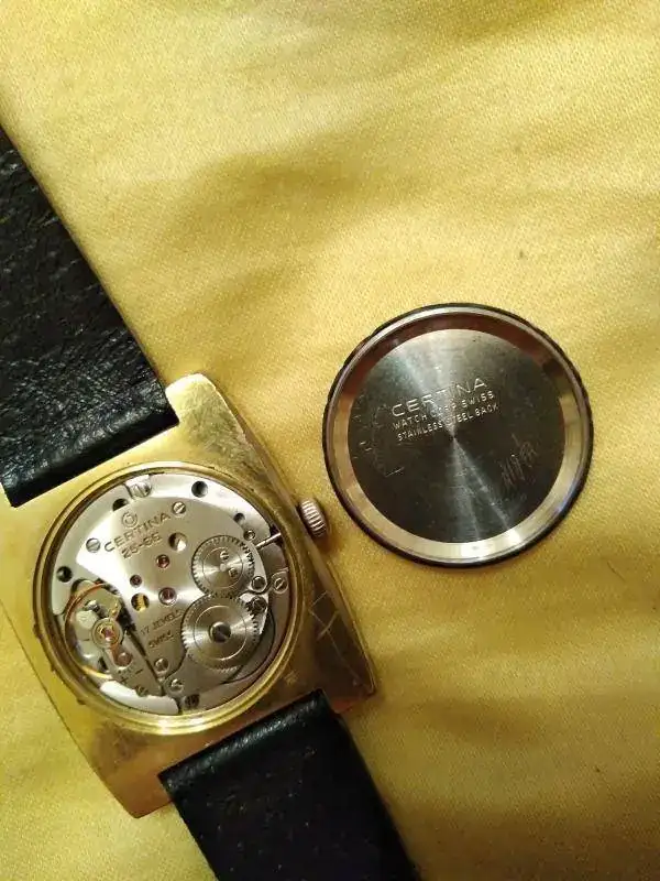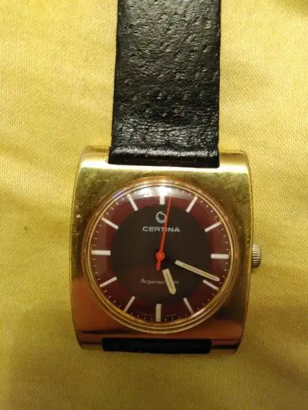 Ofrezco este Certina Argonaut 220 con maquinaria 25-66 de cuerda manual, caja cuadrada dorada y esfera en dos tonos de marrón. La aguja segundera es roja: