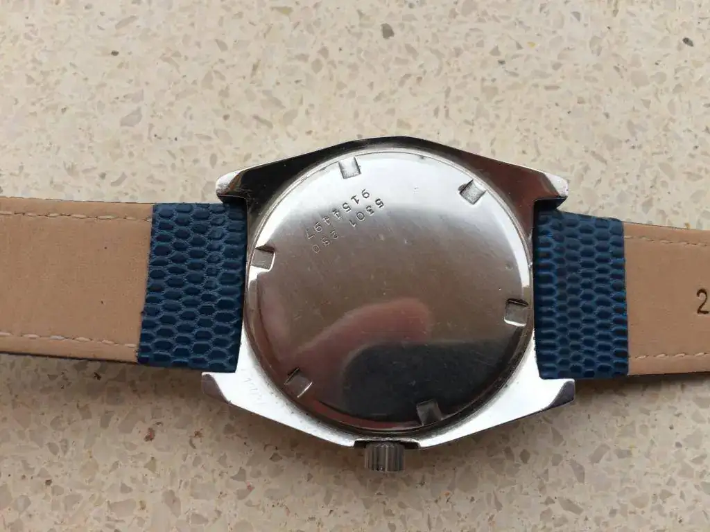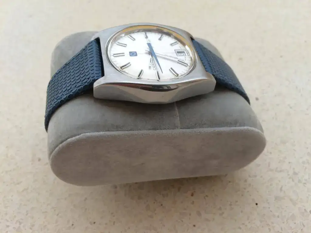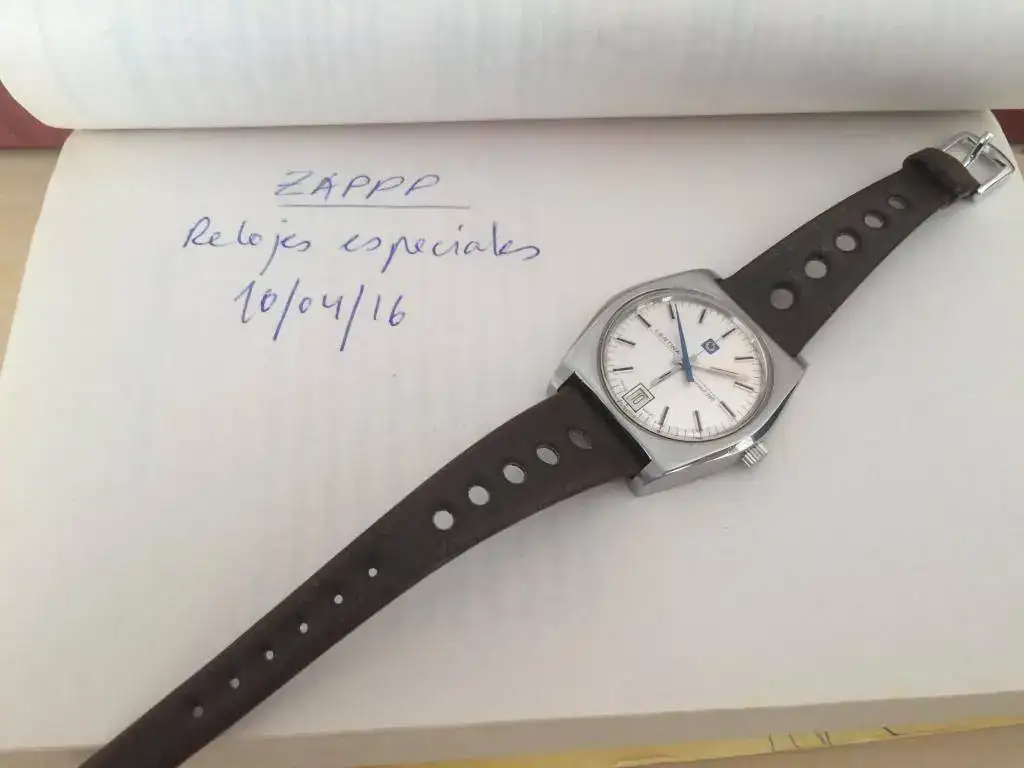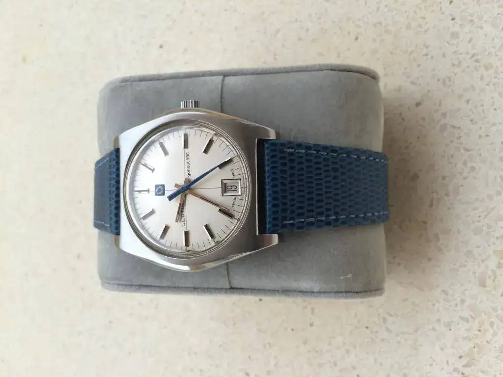 Está montado en una correa vintage Corfam de caucho que compré Nos y me he puesto dos veces. Esta correa es sólo válida para muñecas muy pequeñas como la mía, sería válida para un máximo de 17cms. Por eso doy la elección a quien no le valga o la prefiera de mandarlo en una correa azul de cuero grabado lagarto nueva, hace juego con la segundera. Si a alguien le interesan las dos habría que sumarle 15 €.