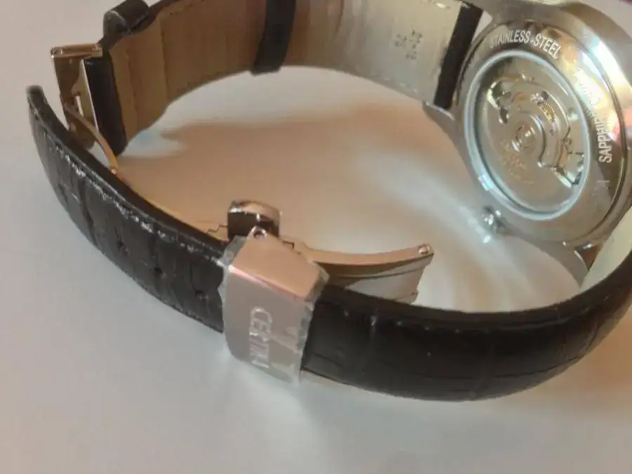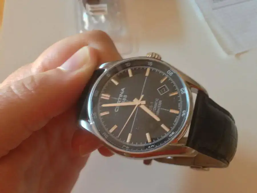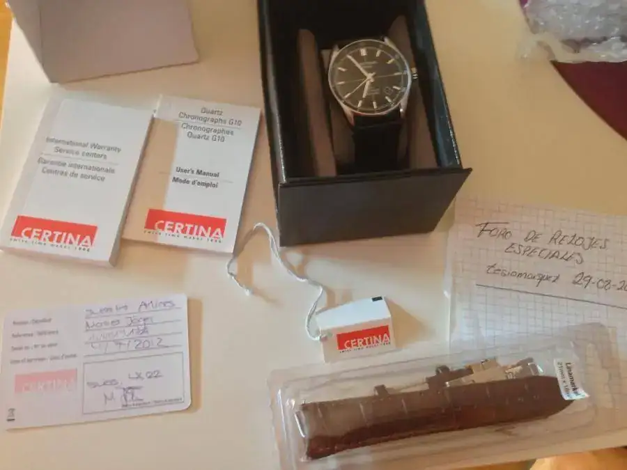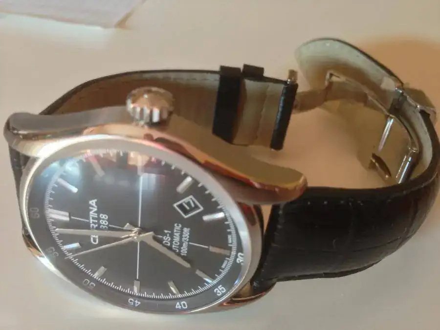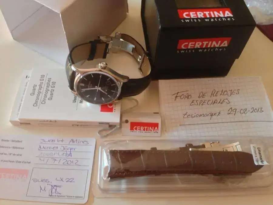 Buenos dias a todos. Saco a la venta este estupendo certina ds-1 en piel negra y extra de marron con deplo casi a estrenar. Esta casi sin uso, apenas 4-5 puestas. El reloj es de junio del año pasado como podeis comprobar en la tarjeta de garantia, aun en vigor. El reloj esta perfecto de cristal y solo he observado un pelillo en la zona de espejo un pelin encima de la corona, que trato de mostrar y que he visto mientras fotografiaba, pero es tan leve que no aparece en las imagenes y a la vista solo se aprecia con fijandose mucho y muy buena vista, pero todo hay que decirlo para que no haya pegas.