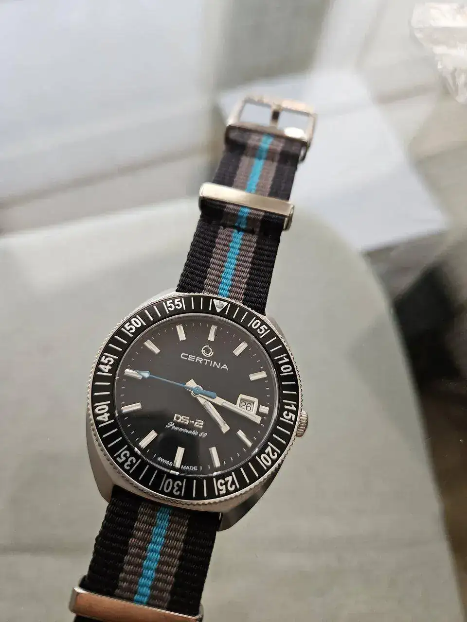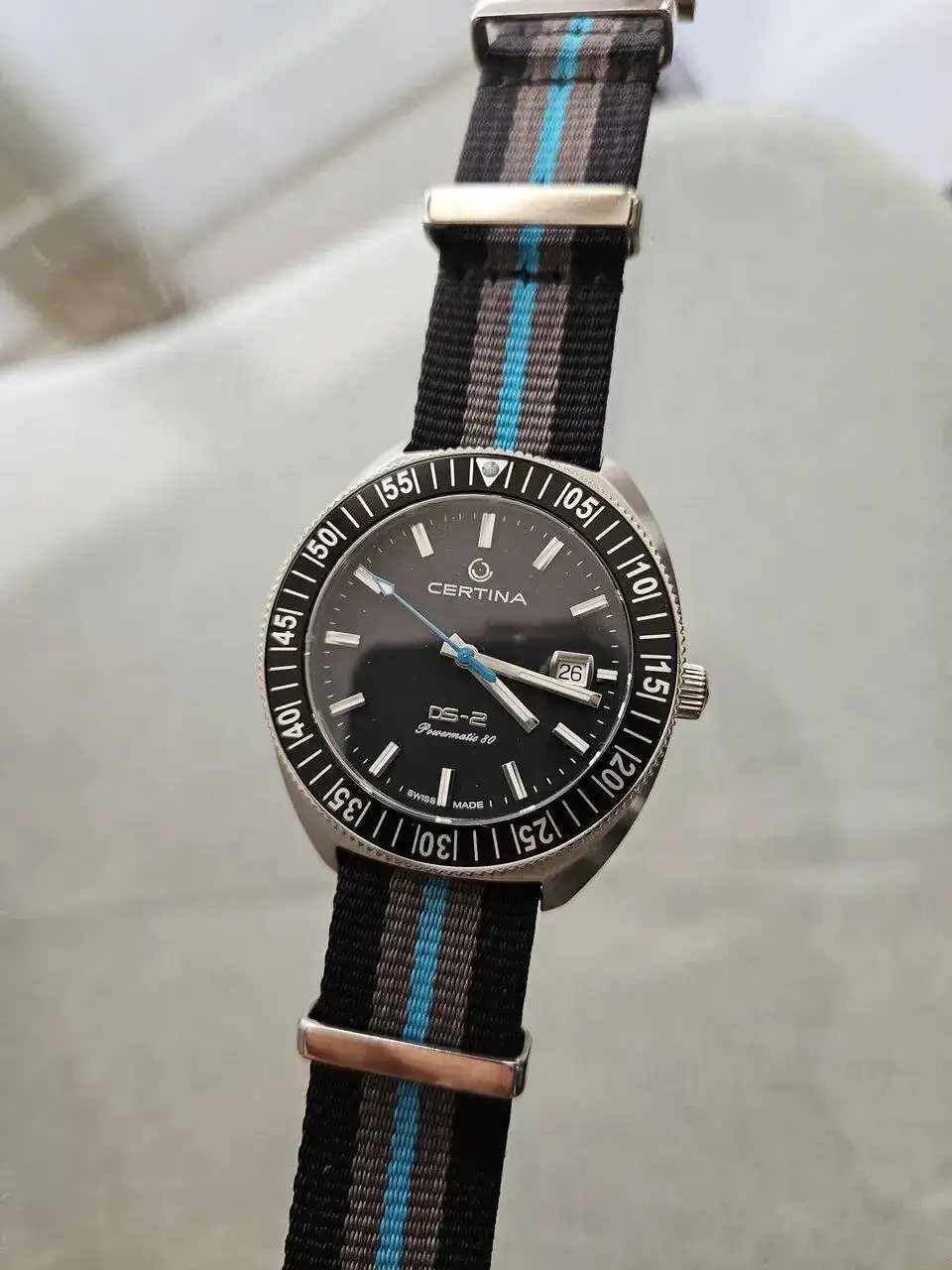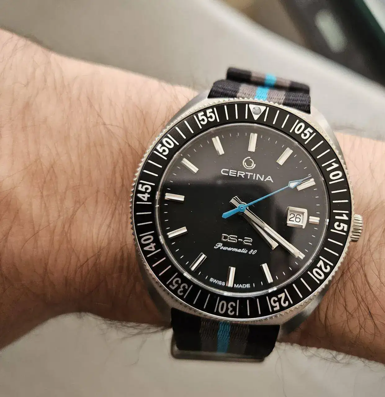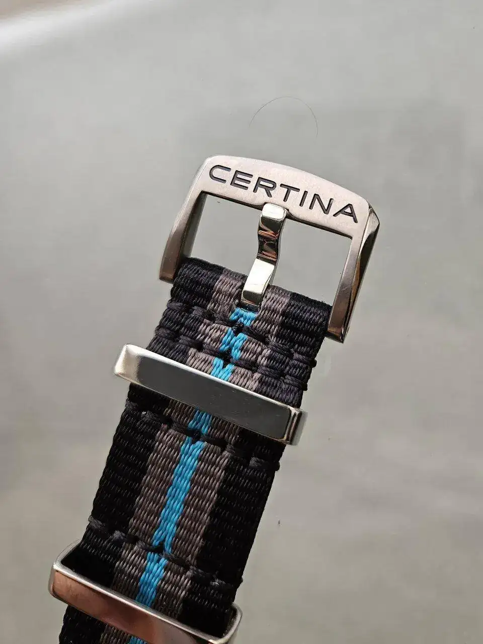 El reloj trae una nato muy cómoda y suave, con bastante de densidad de hilo, vamos que es gordita, y tiene en los agujeros un refuerzo de cuero. Lo que más llama la atención de la nato es la hebilla, de titanio, y con el logo de Certina. Nótese que la hebilla es mate, pulida a espejo y después mate otra vez, un juego de acabados bastante impresionante para una hebilla.