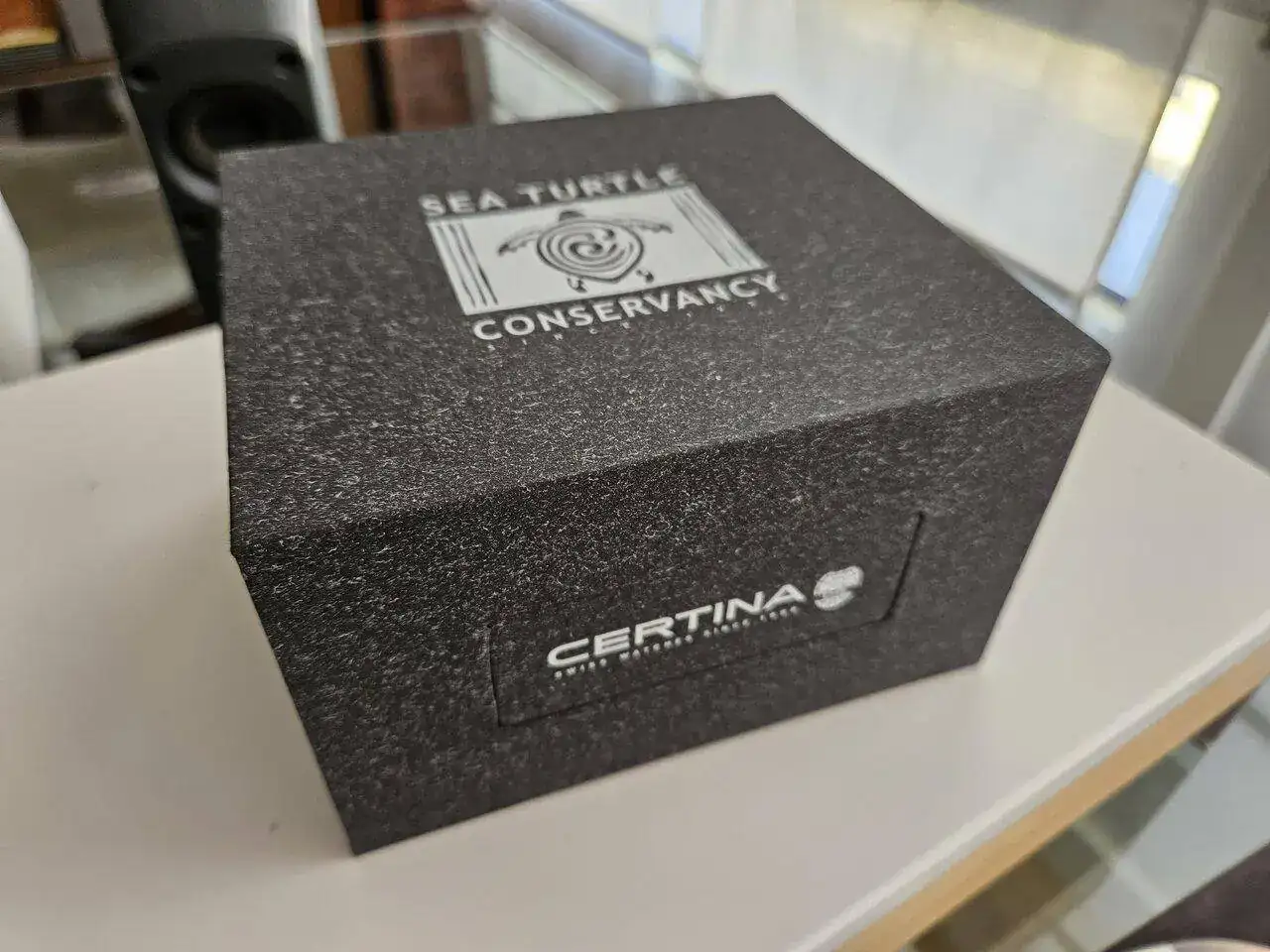 Comencemos por las primeras impresiones. La presentación es muy buena, la caja es de cartón reciclado y como Certina colabora con Sea Turtle Conservancy para salvar a las tortugas marinas, me parece que es coherente que la caja sea reciclada. Aparte de eso venía un estuche de viaje de tela.