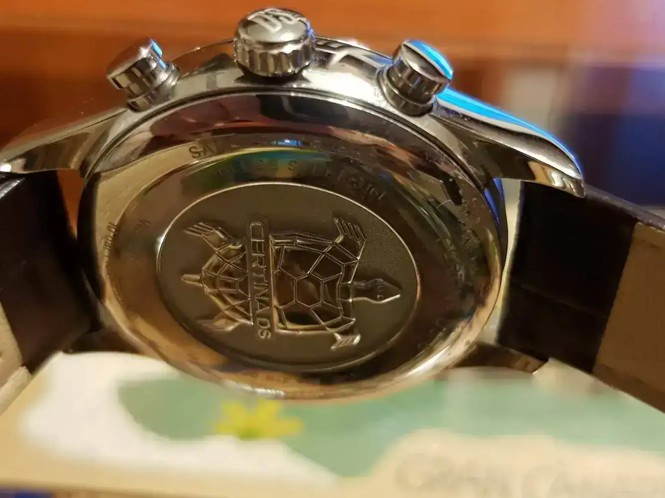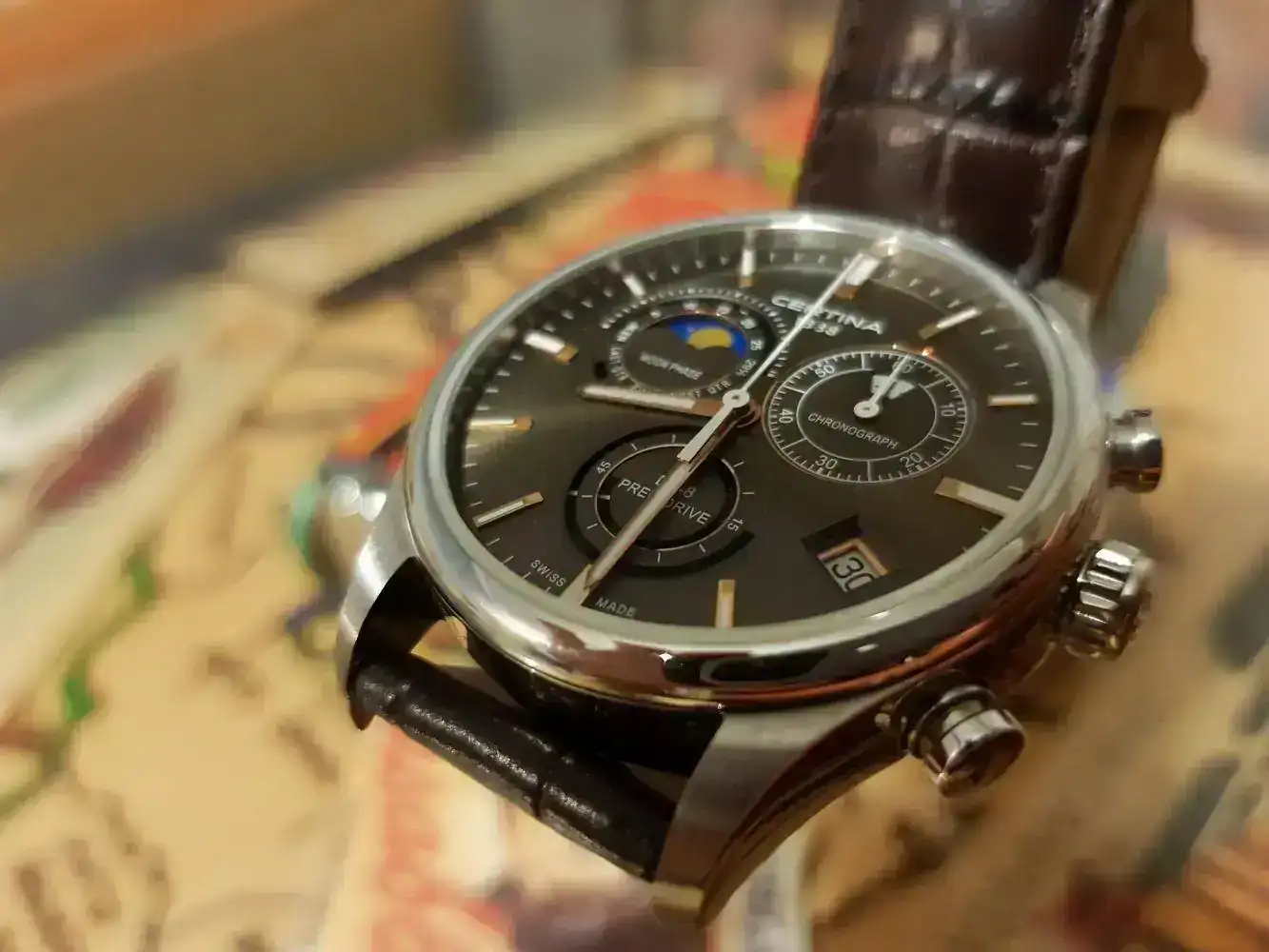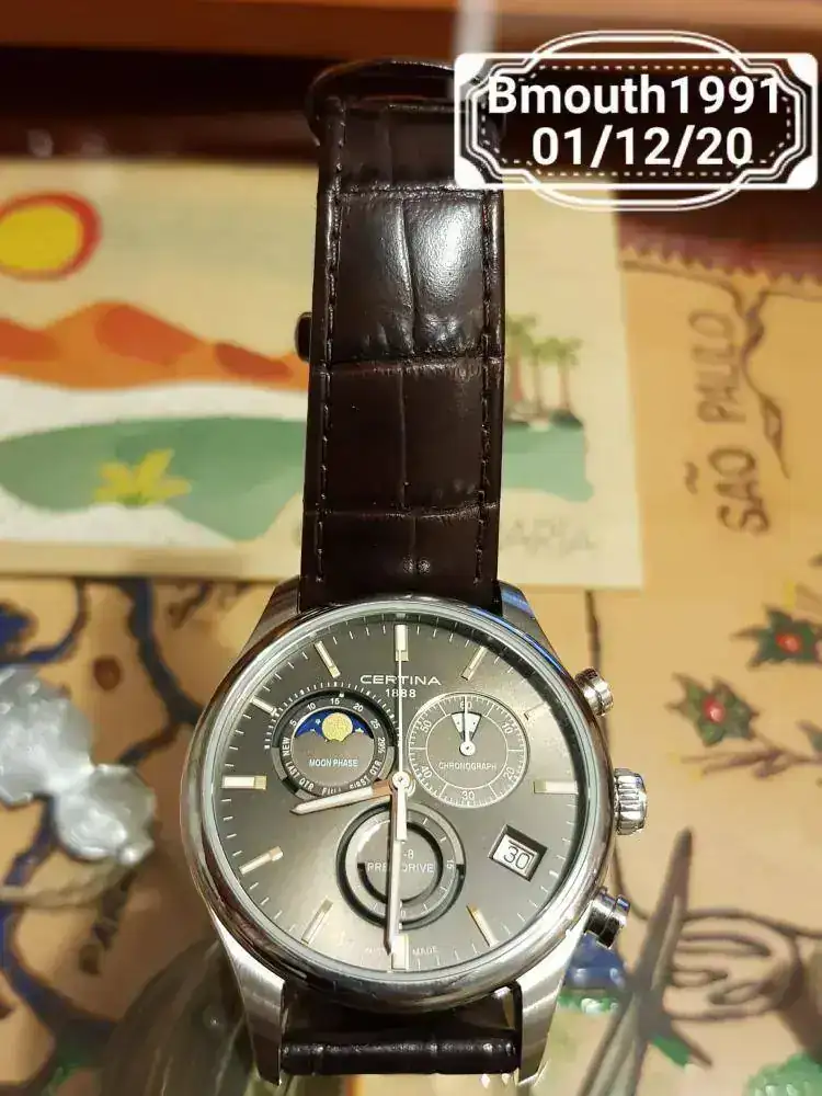 Pongo a la venta mi Certina DS-8 Crono fases lunares, en excelente condición, prácticamente reestreno, sin ninguna marca más allá de los lógicos pelillos del uso en la zona de la hebilla del desplegable de la correa de cuero. El reloj es full set, con cajas exterior e interior, documentación y tarjeta de garantía sellada en concesionario oficial de 2015. He sido el único propietario y los que me conocéis sabéis que tengo mis relojes impolutos, y este no es la excepción. Le pongo un precio bastante ajustado de 390 euros envío incluido y no estoy interesado en cambios. Ahí van sus fotos y la preceptiva ficha.