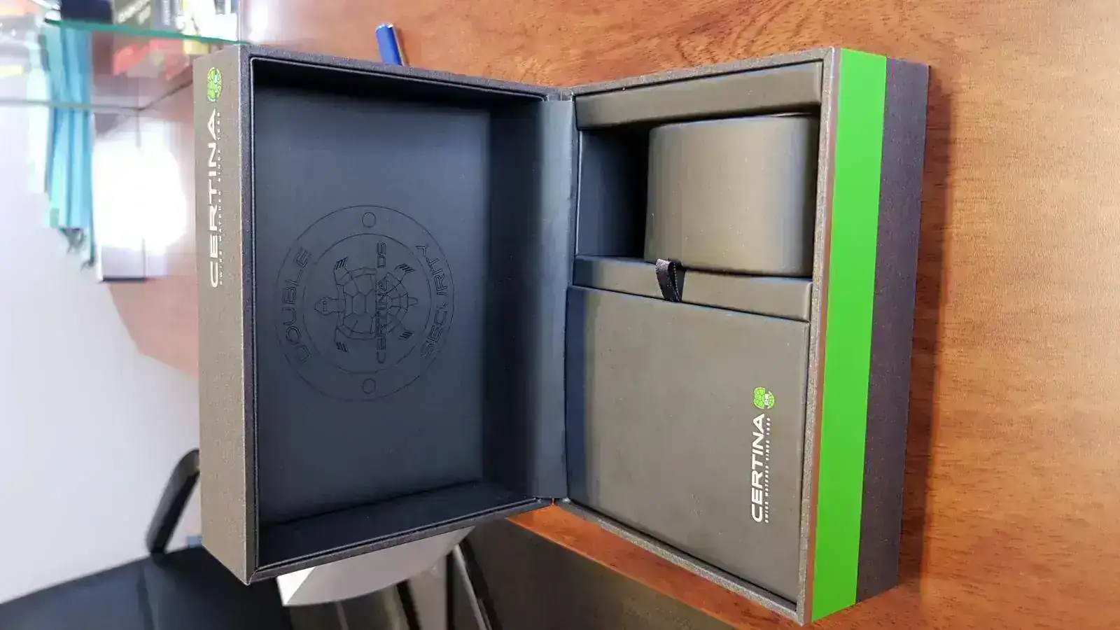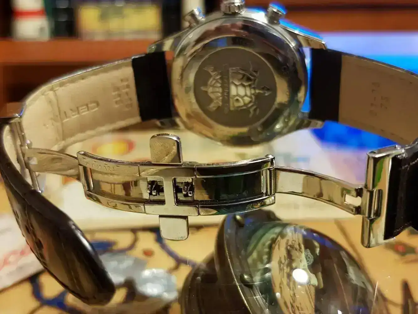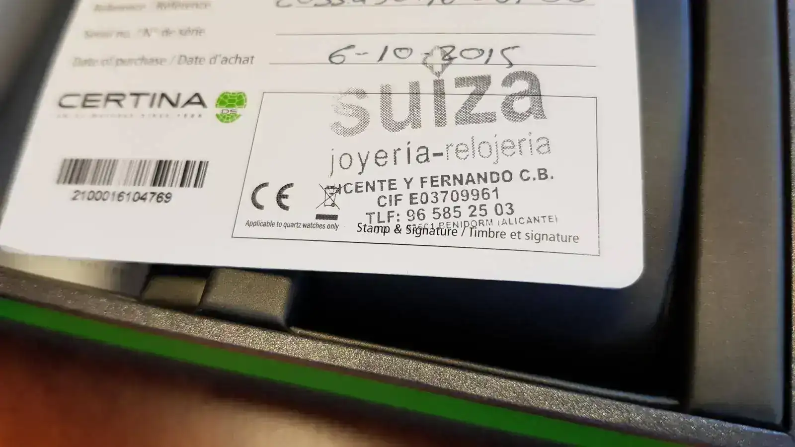 Pongo a la venta mi Certina DS-8 Crono fases lunares, en excelente condición, prácticamente reestreno, sin ninguna marca más allá de los lógicos pelillos del uso en la zona de la hebilla del desplegable de la correa de cuero. El reloj es full set, con cajas exterior e interior, documentación y tarjeta de garantía sellada en concesionario oficial de 2015. He sido el único propietario y los que me conocéis sabéis que tengo mis relojes impolutos, y este no es la excepción. Le pongo un precio bastante ajustado de 390 euros envío incluido y no estoy interesado en cambios. Ahí van sus fotos y la preceptiva ficha.
