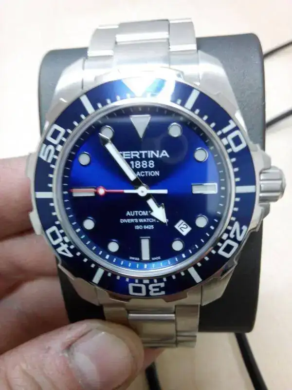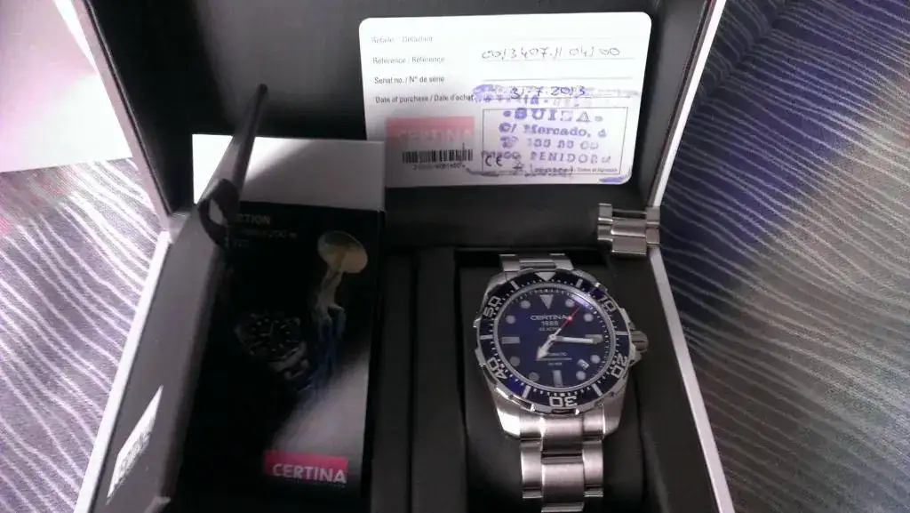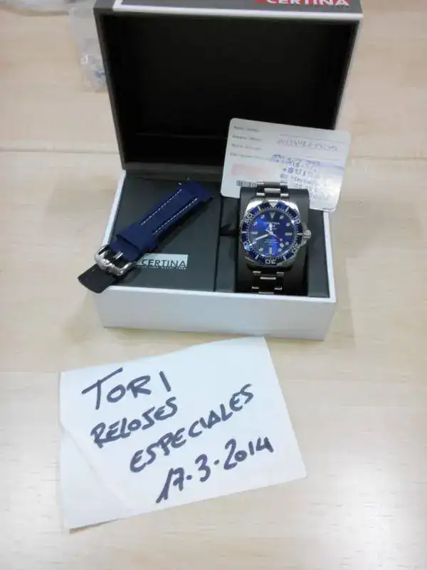 Hola compañeros , pues lo dicho . Me llego fruto de un cambio este Certina en unas condiciones inmejorables , de autentico reestreno , mi idea era utilizarlo este veranito porque es una chulada , pero como no puede ser tengo otra pieza entre ceja y ceja por lo que debe de salir . El reloj esta tal cual me llego , impoluto en su caja , yo no lo he usado nunca , tiene su set completo , caja , tarjeta de garantia sellada a fecha de 31-7-2013 y eslabones sobrantes , tambien añado una correa Hirsch Freestyle Azul que le queda genail ( la tenia de otro modelo sin estrenar y asi sigue nueva nueva ) y poco mas que añadir de este modelo , aun asi para no extenderme demasiado añadire un link de la pagina oficial donde se detallaran mejor sus caracteristicas .