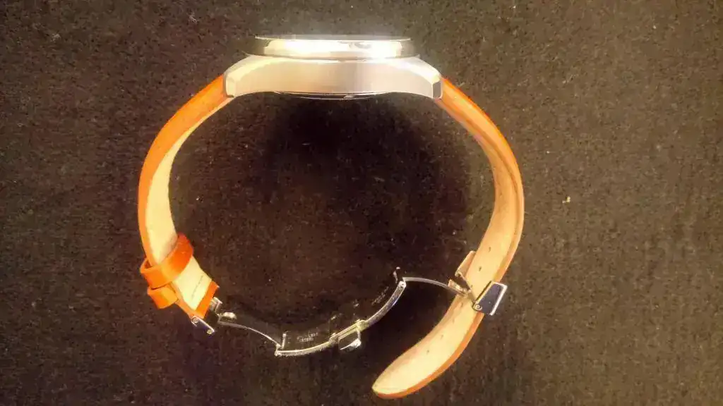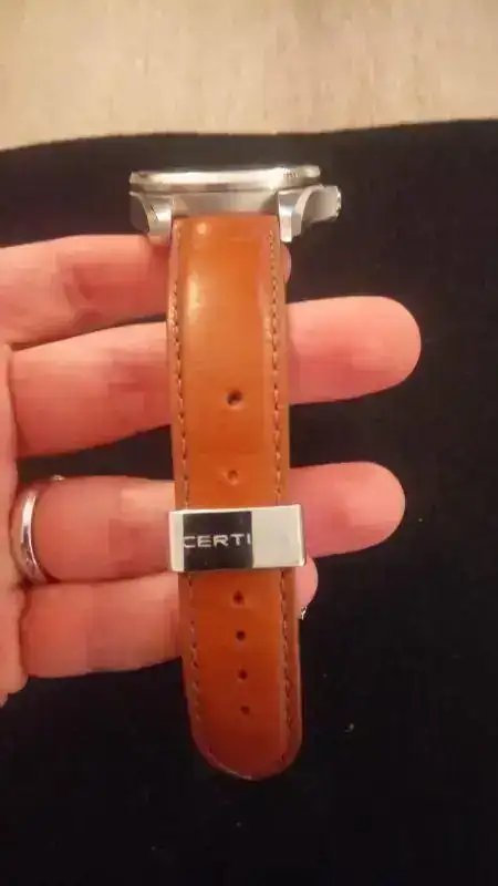 La verdad es que las fotos no le hacen justicia, ya que en vivo es precioso, los reflejos del dial son una pasada, y la caja está muy bien construida, alternando superficies cepilladas y pulidas. La correa no tiene ninguna puesta, salvo para probármelo, con un agujero extra que le hice, el cierre es deployante. El estado del reloj es prácticamente de reestreno, salvo algún pelillo que se me haya podido escapar (sobre todo en el cierre del deployante puede haber alguna marca más), pero en general está perfecto.