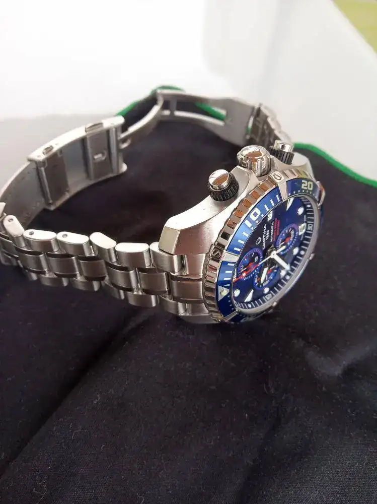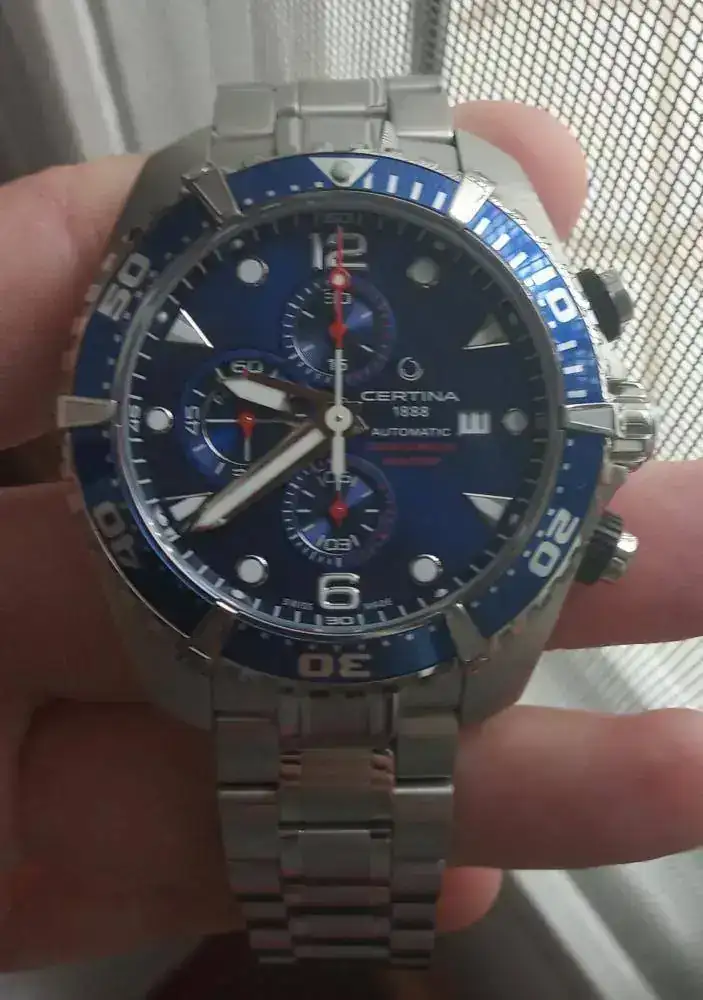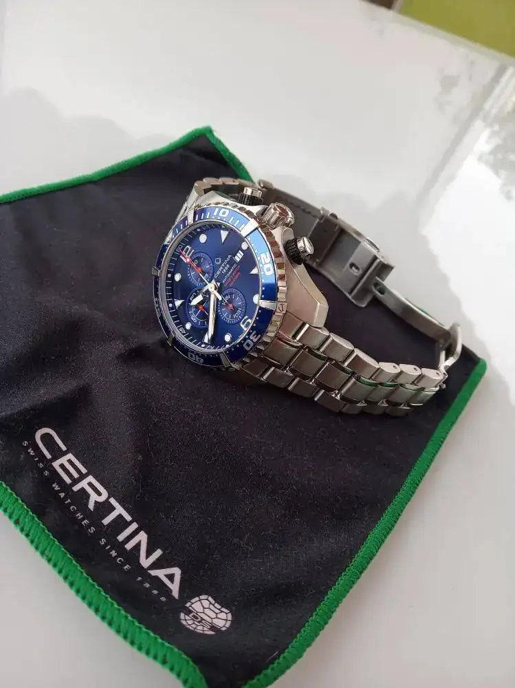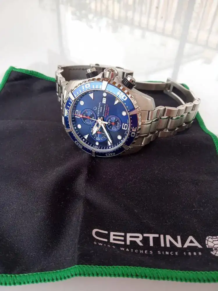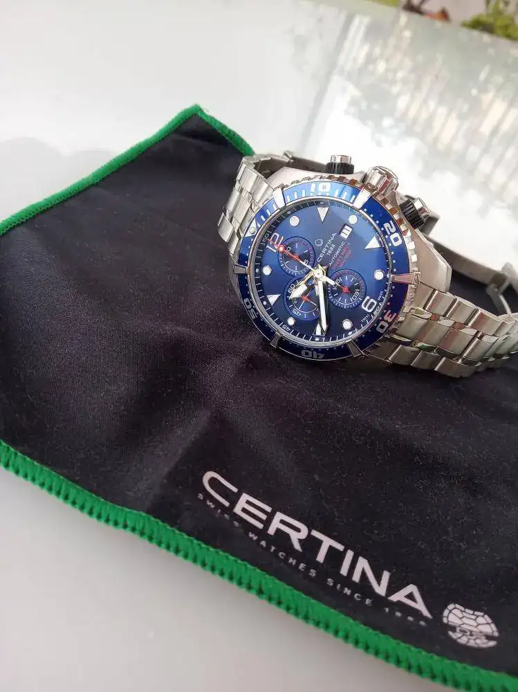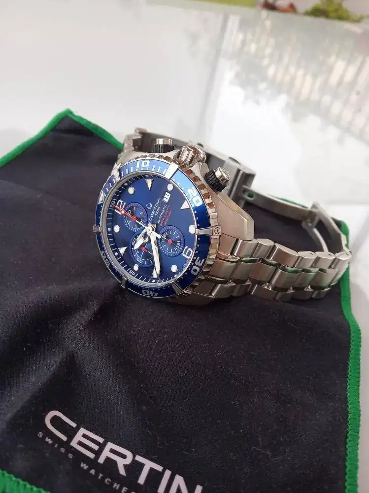 Se trata del Certina Action DS Cronograph automático, caja de 45mm con cristal de zafiro con A.R., esfera azul eléctrico impresionante, corona y pulsadores a rosca recubiertos de PVD, cierre con sistema de fácil ajuste, calibre c01-211 con base en el Lemania 5100, Superluminova en azul, ISO 6425, 300 metros...