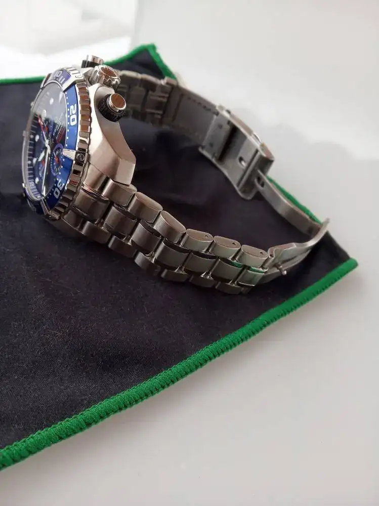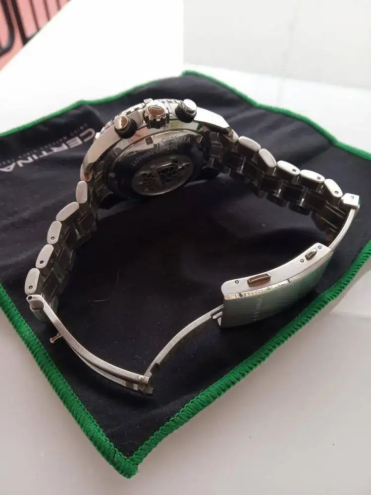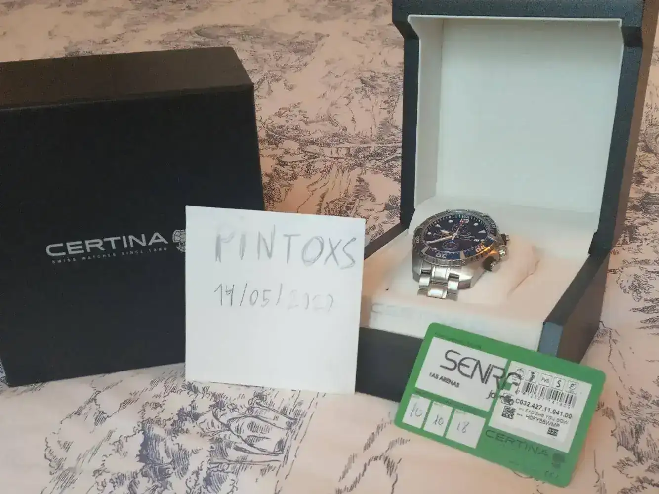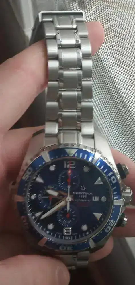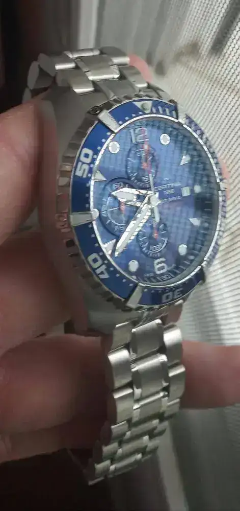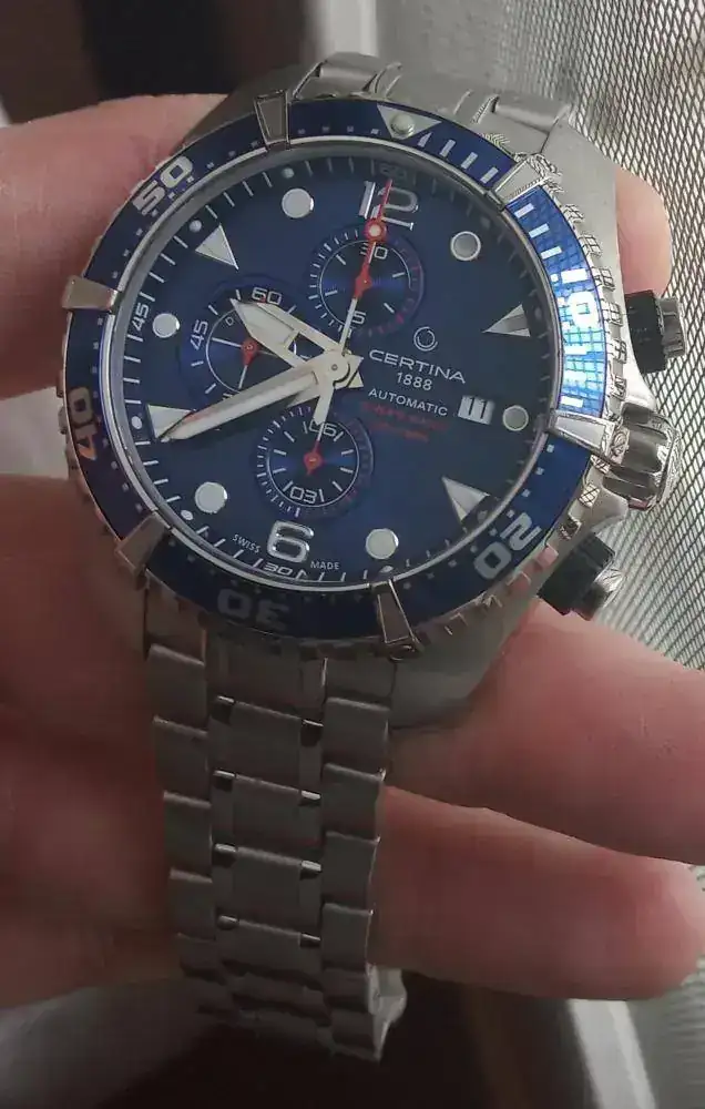 Se trata del Certina Action DS Cronograph automático, caja de 45mm con cristal de zafiro con A.R., esfera azul eléctrico impresionante, corona y pulsadores a rosca recubiertos de PVD, cierre con sistema de fácil ajuste, calibre c01-211 con base en el Lemania 5100, Superluminova en azul, ISO 6425, 300 metros...