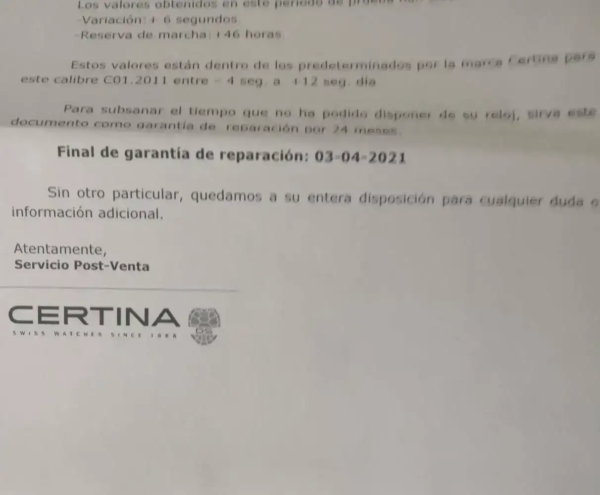 Tiene garantía hasta abril de 2021 aunque en la tarjeta figure octubre de 2020. Lo envié al SAT para ajuste porque venía en +15 segundos, cuando lo devolvieron ampliaron la garantía hasta la fecha en que fue enviado. Un 10 por el SAT, ojalá otras marcas tuvieran uno igual... (adjunto documentación del SAT).