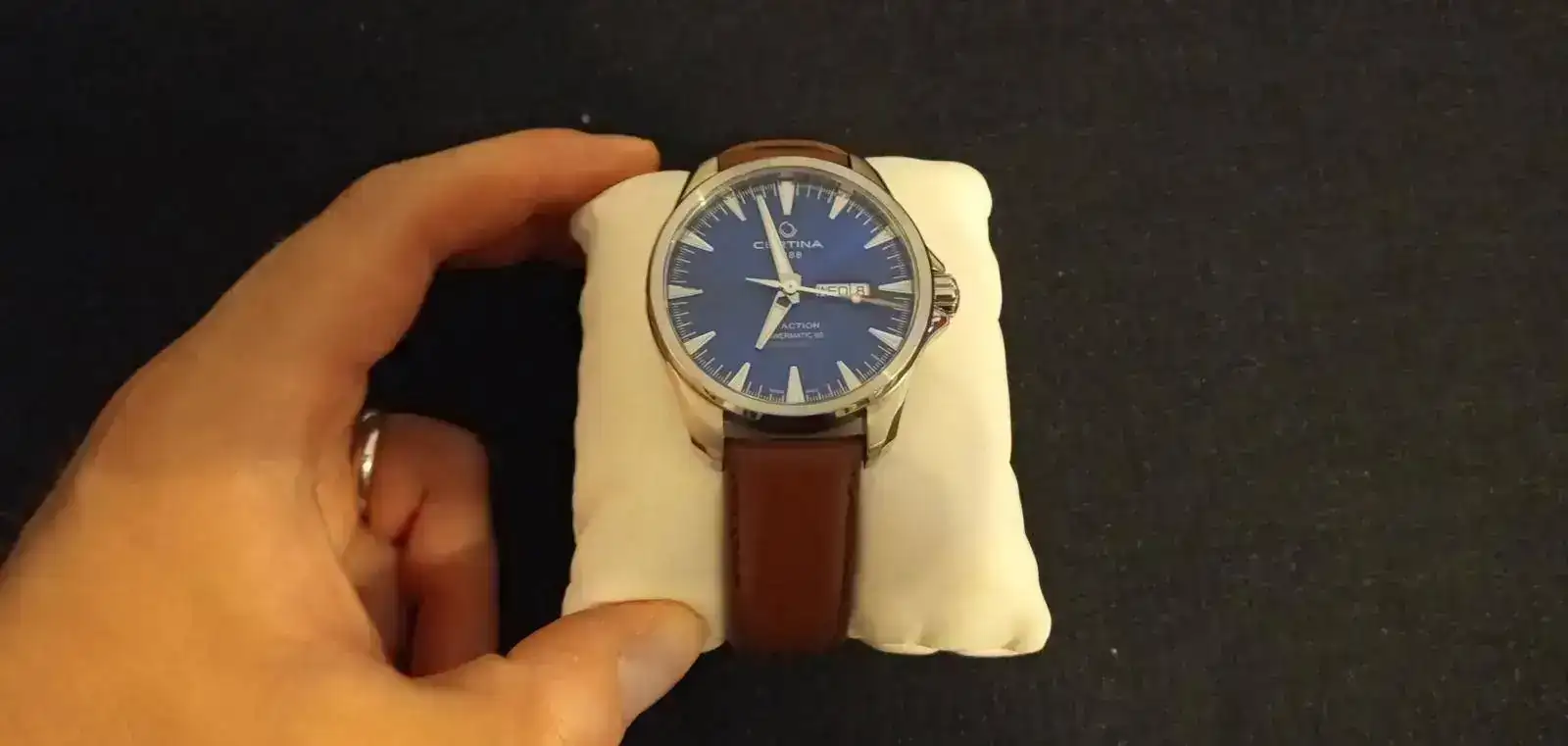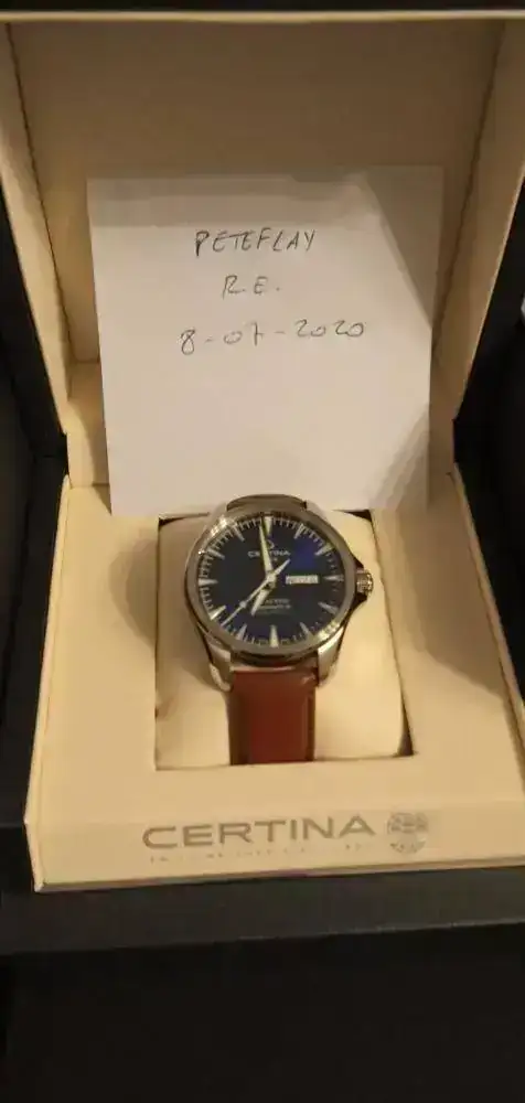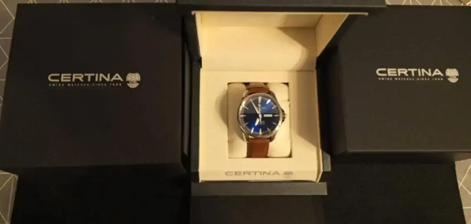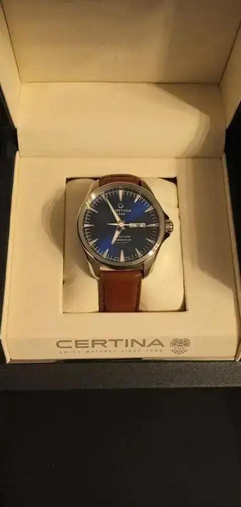 Pongo a la venta este precioso Certina DS Action Day-Date, comprado en CO nacional el pasado enero, pero que me lo he puesto muy poco, unas 5 ó 6 veces (por eso lo saco). El reloj está en perfecto estado, de hecho la correa no ha sido ni estrenada, ya que el primer día se la cambié, y las pocas veces que me lo he puesto lo he llevado con la otra. Como digo, el reloj está impoluto, salvo por unos ligeros arañazos en la parte interior de dos de las asas, fruto de ese cambio de correa. Está muy bien construido, la verdad, y tiene una calidad muy buena, es sumergible a 200m y lleva la corona roscada.