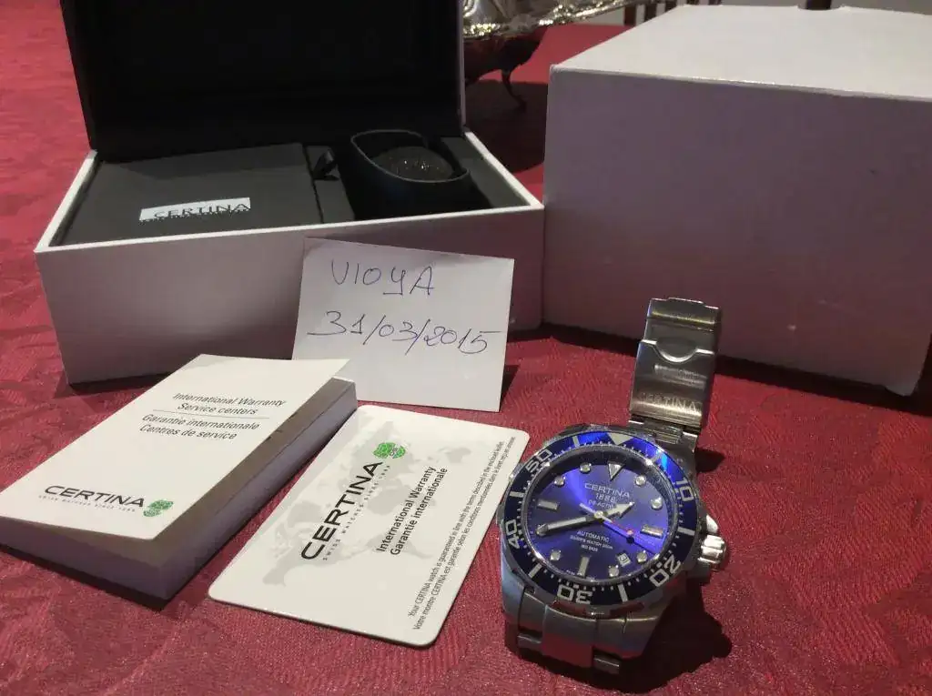 Hola, saco para venta, exclusivamente, (no cambios), mi Certina DS en su magnífico color azul. Comprado en mercantes en abril de 2014, por lo que tiene todo un año de garantía por delante. Estado muy bueno, sólo señalar las lógicas marcas de un uso continuo pero cuidadoso, con los típicos pelos en armis y cierre. Caja, bisel de enamel y cristal en perfecto estado. Los dientes del bisel tienen algún pelo, aunque sólo visibles con macro.