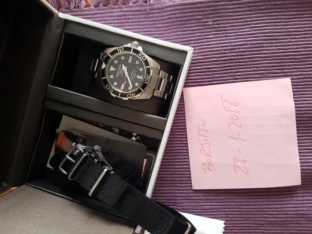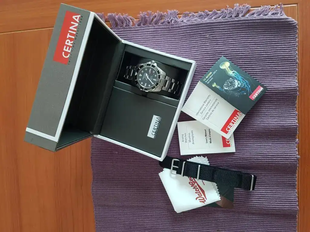 Acompaño el reloj con su documentación su caja y de regalo una CORREA ZULUDIVER NATO de 21mm. Esta correa ya solo vale casi 30 euros cuando la pides por Internet y de calidad premium.