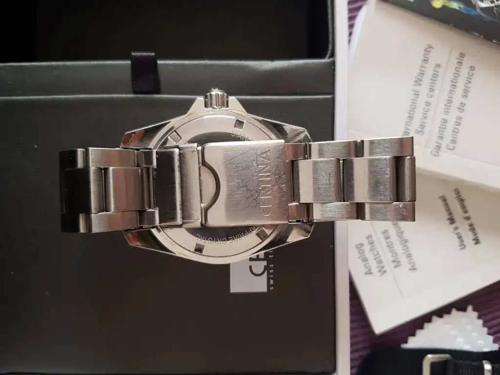 El reloj esta en buen estado y funciona a la perfección. Si lo que buscas es algo nuevo este no es tu reloj ya que ha sido usado y tiene pelillos y alguna raya en correas y algunas marcas en el bisel.