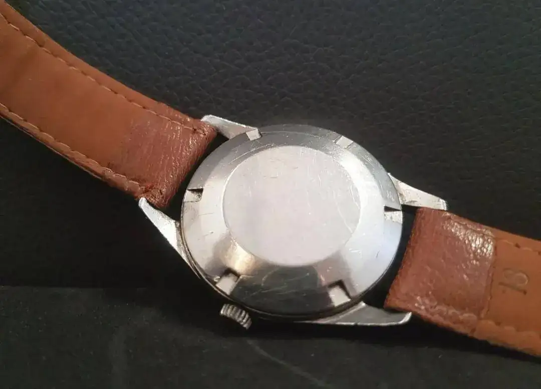 Lo que no me esperaba es encontrar una esfera tan bonita -a mi parecer- como la del reloj que me ha llegado: ha desarrollado una pátina uniforme color gris acero, que es de mi preferencia. El ejemplar recibido -referencia 5601 112, movimiento 25-65, de 1964- está en unas condiciones muy buenas, y tiene la corona firmada.