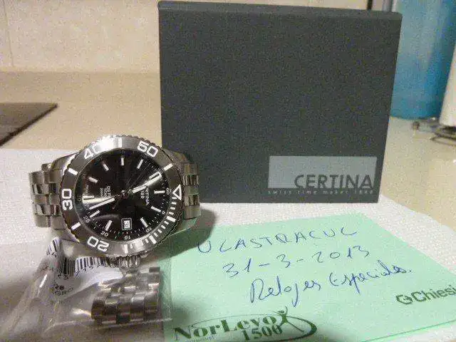 Hola buenas noches a todos/as...pues eso que vendo este Certina ds first cuarzo en titanio,el estado del reloj es bueno,con microrayas y algun arañazo superficial(las cosas del titanio),el cierre si tiene mas trote pero nada escandaloso,el cristal impoluto.Es un reloj muy comodo y ligero,monta una etasa 955.112(la misma que omega en sus seamaster de cuarzo)y su precision es fantastica no sabria exactamente cuanto desvia al mes pero no llega a los 5 segundos.La unica pega para que tiene el reloj,es que la aguja del secundero no se alinea con sus marcas hasta el segundo 30 mas o menos,antes lo hace con unas intermedias que tiene la esfera(lo lleve a la tienda donde lo compre estando todavia en garantia y lo mandaron al sat de certina...y lo devolvieron tal cual alegando que no afectaba en nada a la precision...)lo aviso para que no haya malos entendidos.Lo mejor que lo vendo en 175 eur envio incluido...o tambien podria cambiarlo por algun diver japones(que no tengo ninguno)eso si con parada de secundero,bueno ahora las fotos del reloj en cuestion: