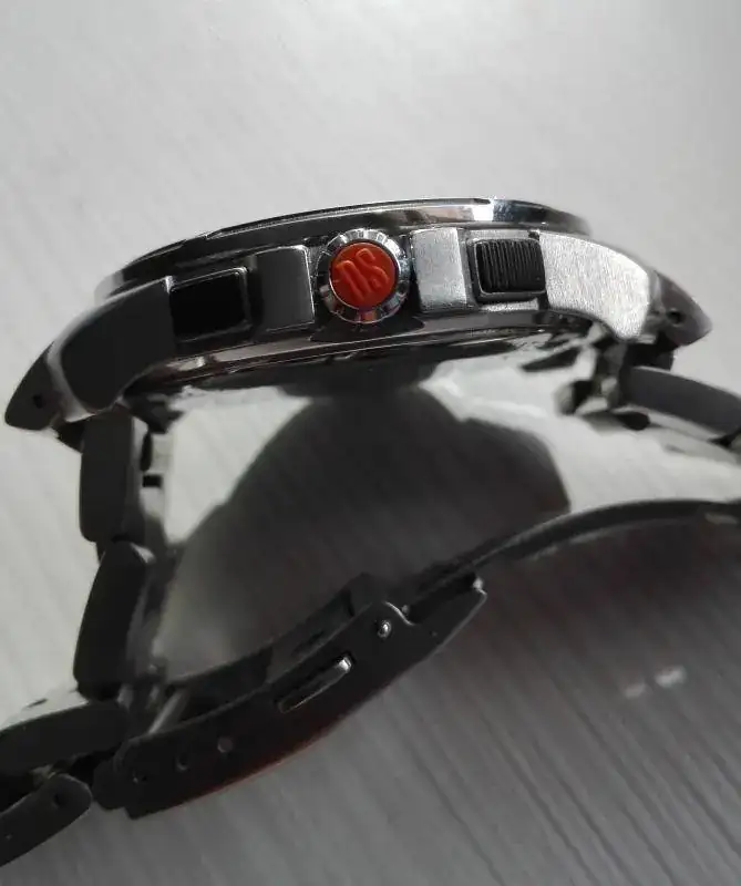Por lo que respecta a la corona, está protegida y adornada en un extremo con caucho anaranjado, y los pulsadores que la complementan presentan una superficie de PVD negro.