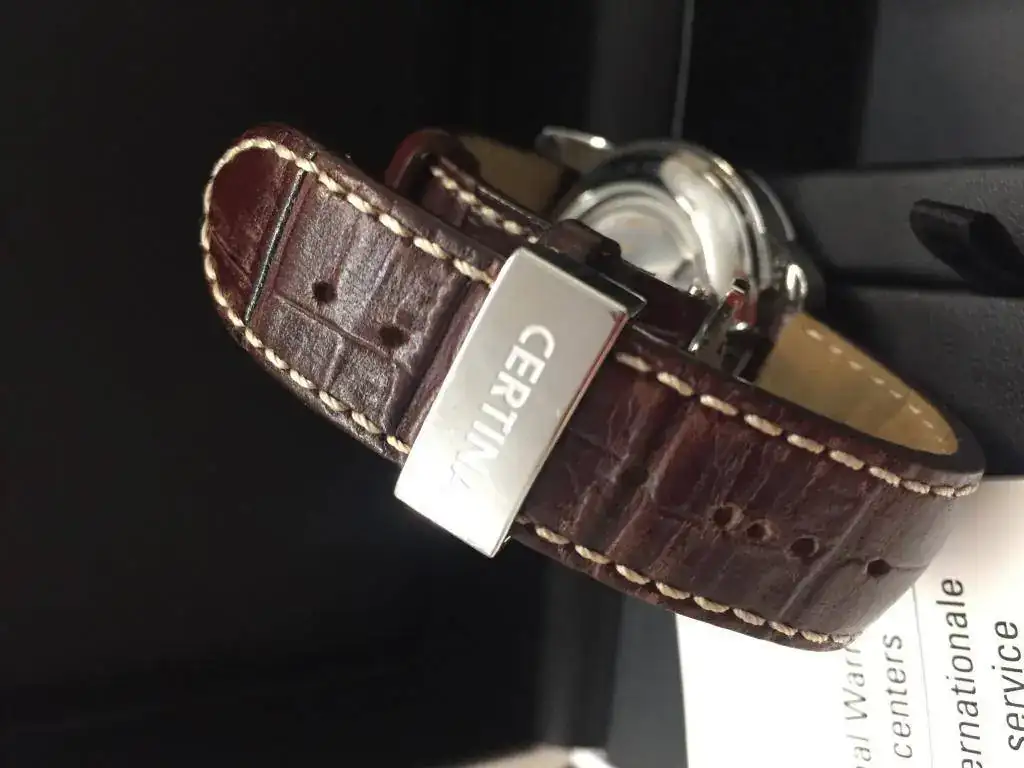 La correa (original) está agrietada interiormente (en muy buen estado por el exterior), pero aún le queda uso. El cierre CERTINA con "pelillos".