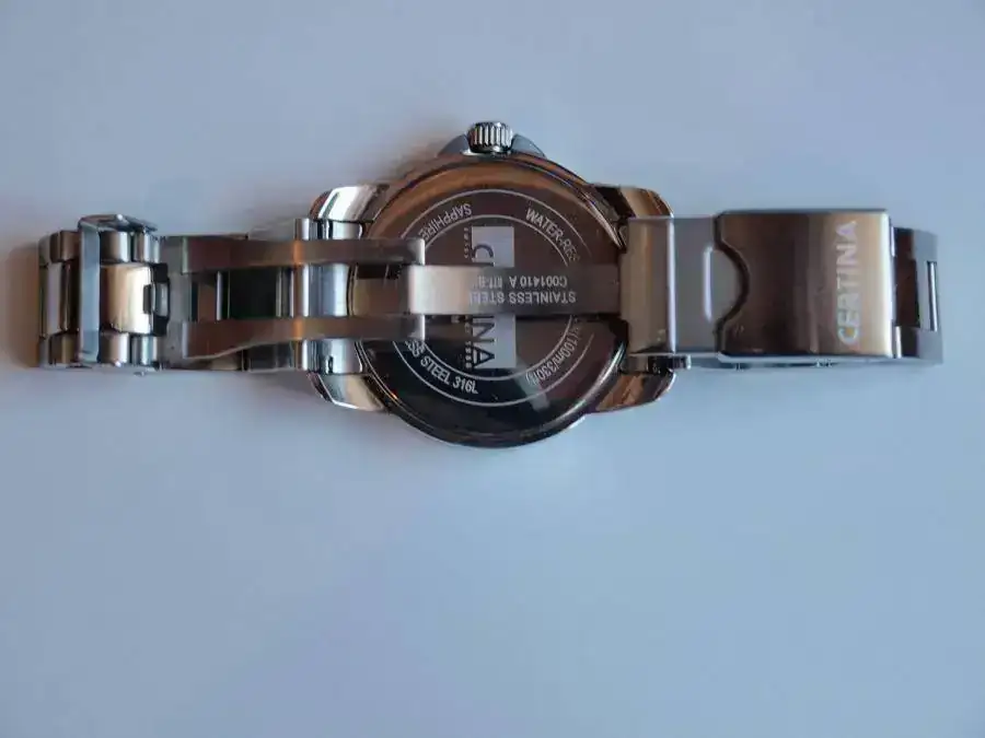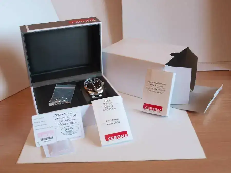 EL reloj fue comprado en Noviembre del 2012 por lo que le quedan 17 meses de Garantia internacional ,sellado en su tarjeta ,dotacion completa: caja blanca esterna caja dura de certina con 2 libros de instrucciones , eslabones sobrantes con dos pasadores de recambio .El reloj presenta los tipicos pelillos de un reloj a espejo practicamente al 95% siendo tiquismiquis como somos por aqui .Es el reloj mas elegante que he tenido y para traje el mejor sin desmejorar en plan deportivo.