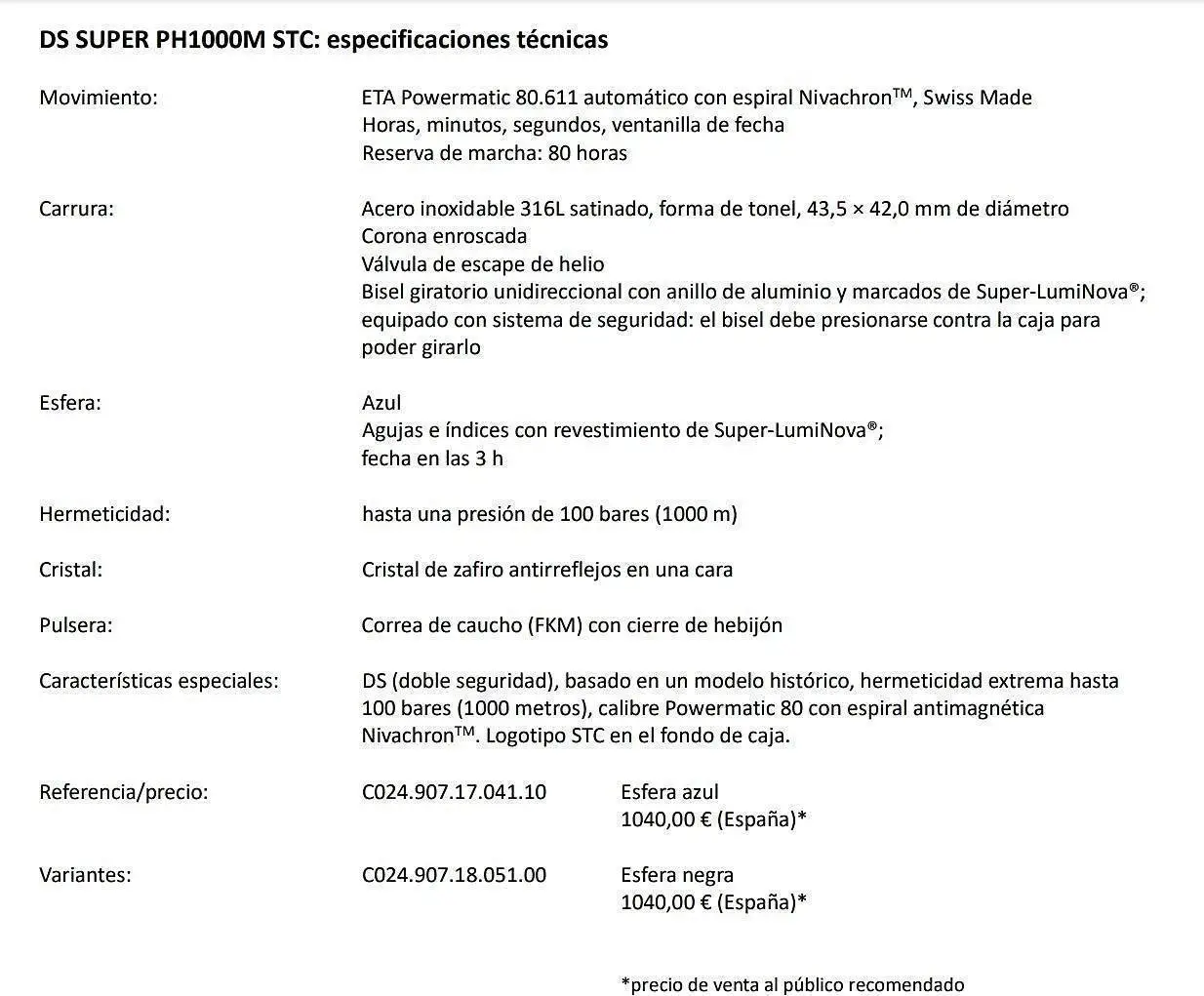 Certina refuerza su colaboración a largo plazo con la STC con el modelo DS SUPER PH1000M STC. Inspirado en el histórico DS SUPER PH1000M de 1970, este reloj presenta una esfera azul con toques de color naranja e índices luminosos. Su movimiento Powermatic 80 ofrece una reserva de marcha de 80 horas y una espiral NivachronTM.
