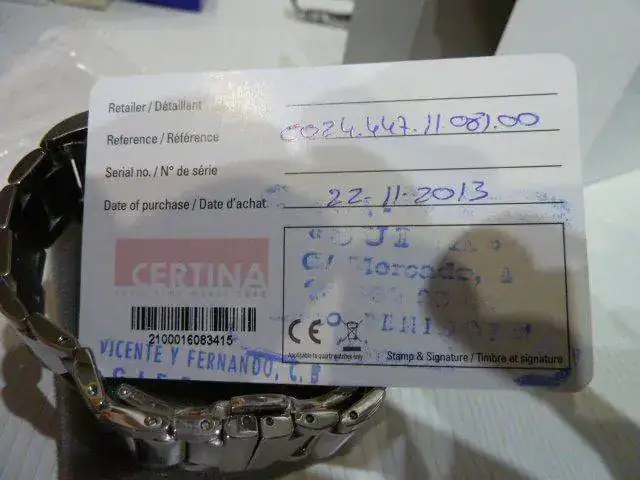 Dotacion:El reloj se envia con su caja externa blanca,interna de dos colores cobrizo/blanco,tarjeta de garantia sellada y fechada,eslabones sobrantes del armis(esta ajustado para unos 18cm)librito de instrucciones especifico del reloj y otro general de Certina.