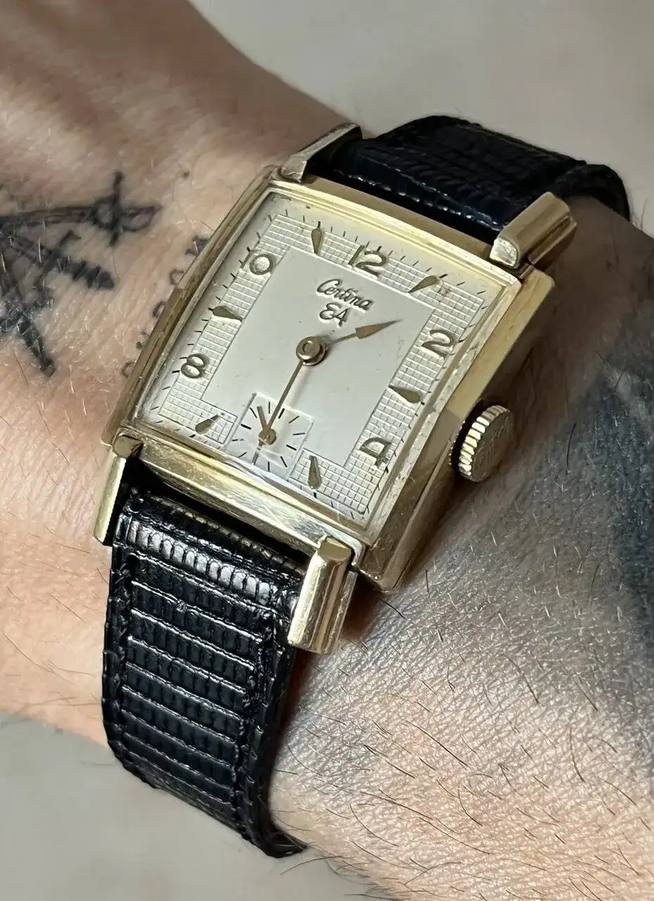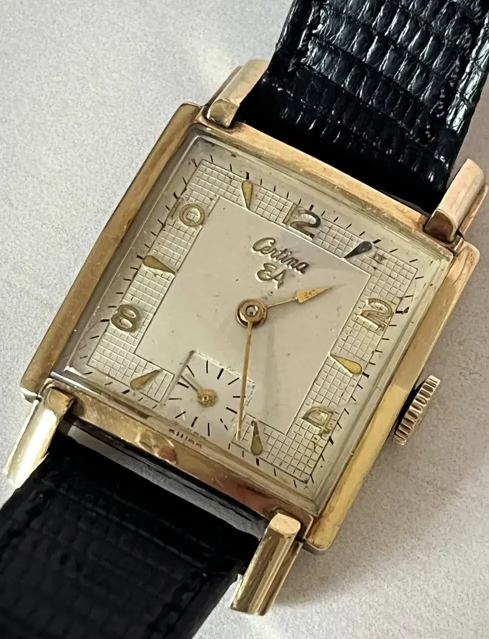 Buenas tardes, con ilusión os presento este abuelete recién adquirido, se trata de un Certina EA, nomenclatura que usaron durante los años 50 para los relojes exportados a los Estados Unidos. A mi particularmente me parece un reloj precioso y original, de cuerda manual con su corona firmada y con un funcionamiento excepcional para tener más de 70 años a sus espaldas. Fue comprado por su anterior propietario hace como 20 años en Canada, dejo un poco de información extraída de un hilo antiguo dentro de este maravilloso foro, sin más, espero que os guste.