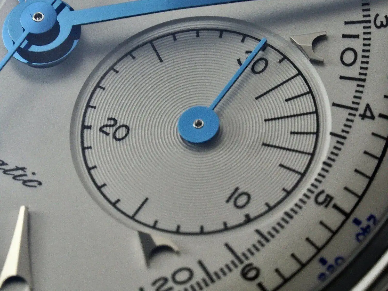 Tras el azul de las agujas conviene tirar de lupa y perderse en todos los detalles de la esfera. Se reproducen dos escalas de cálculo, taquimétrica en azul, y telemétrica en negro. Podéis apreciar en este macro también la curvatura exterior de la esfera.