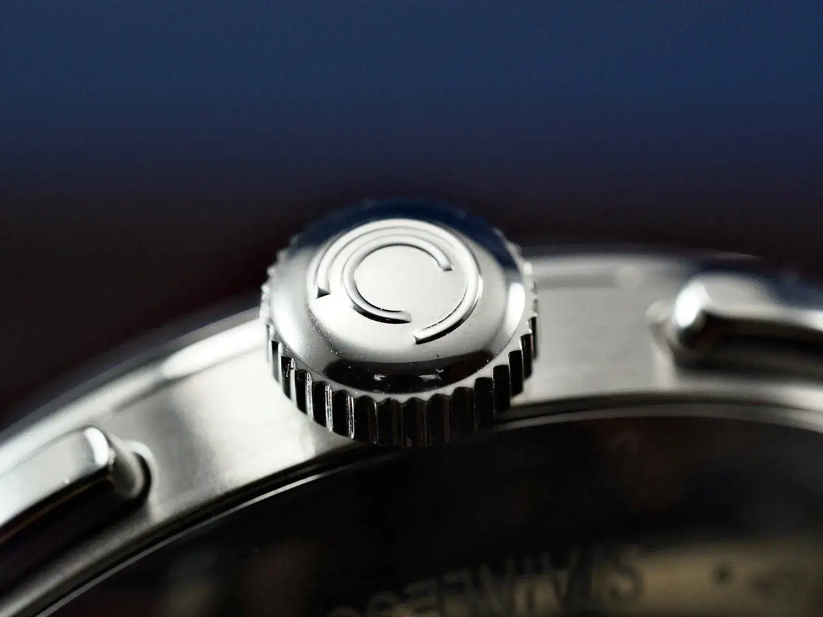 Una foto del lateral de la caja donde vemos la generosa corona, decorada con la doble C de Certina, y los pulsadores planos característicos de los cronógrafos de la época.