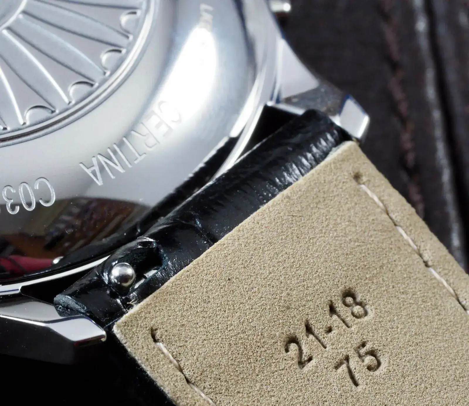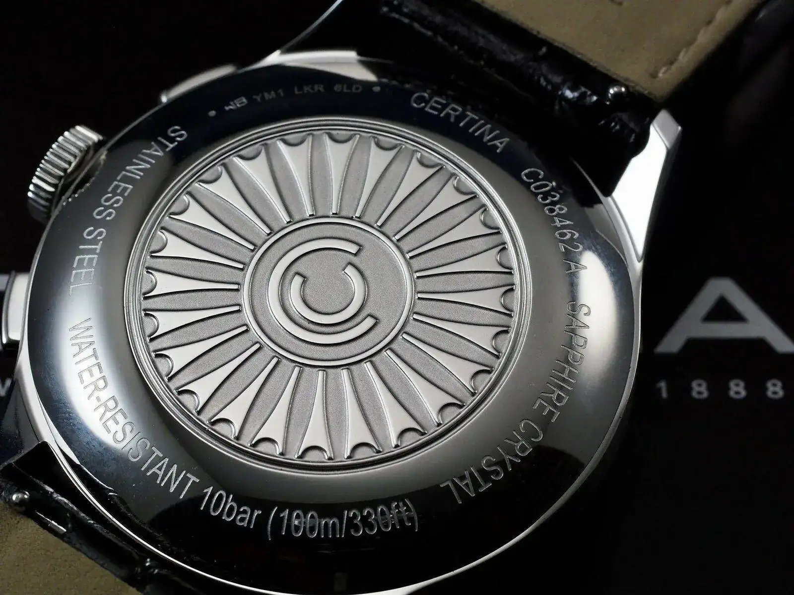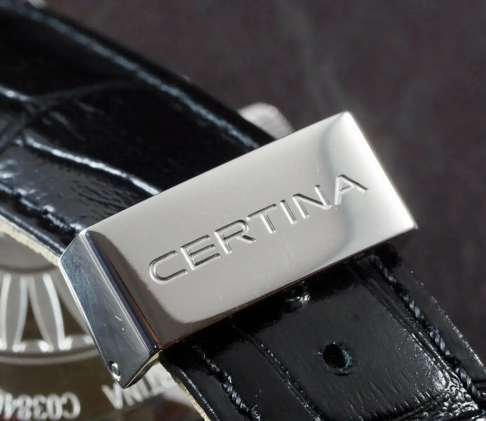 En cuanto al tema técnico , todo está en la web de Certina. El calibre es un sempiterno y fiable Valjoux 7753 con 60 horas de reserva de marcha. Cristal de zafiro abombado, y 42 mm de caja que si bien se hace grandota, al tener las asas curvadas no lo parece tanto. No es una paellera, pero sí es un reloj grande.